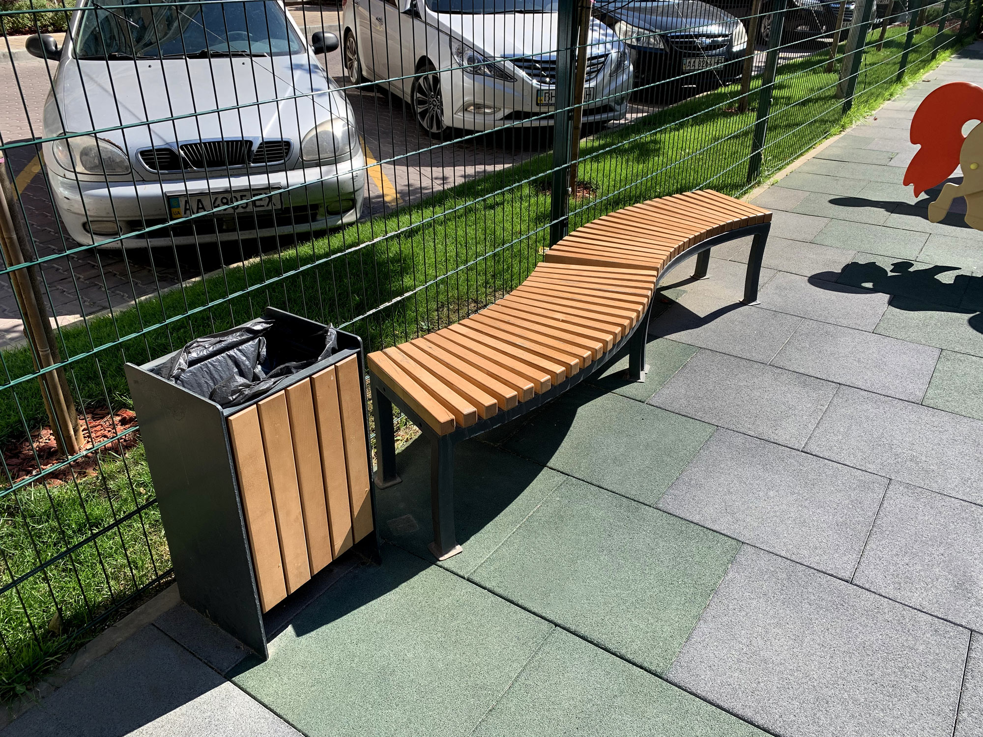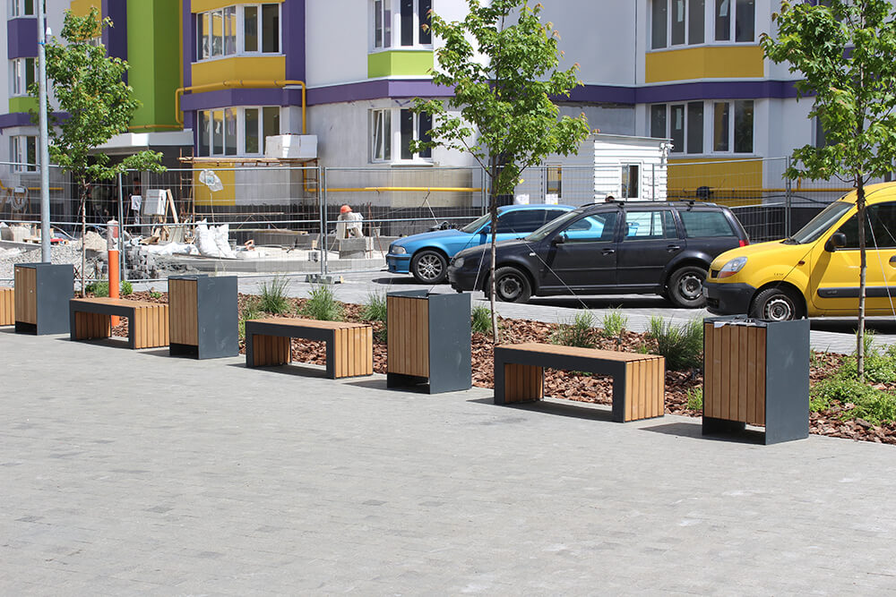 Tilbehør som avfallsbeholdere, sykkelstativer og plantekasser bidrar til et ryddig, funksjonelt og estetisk helhetsinntrykk. Sammen med møblene skaper dette et gjennomført og inviterende uterom.