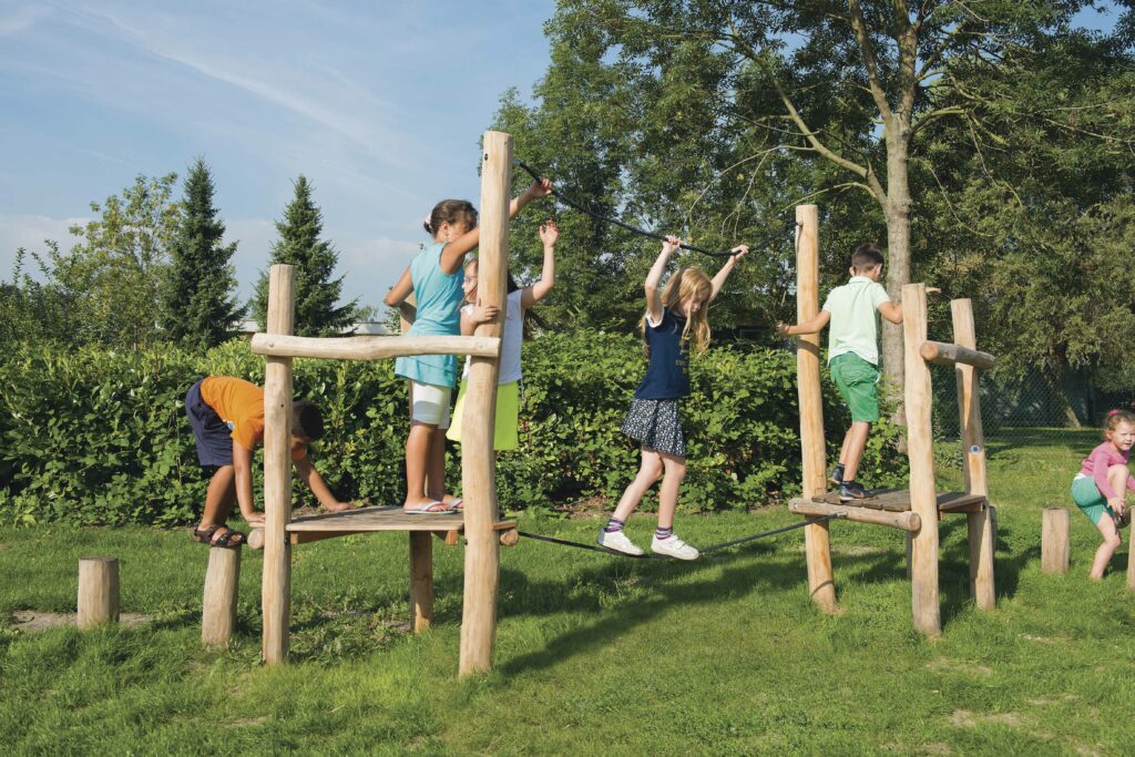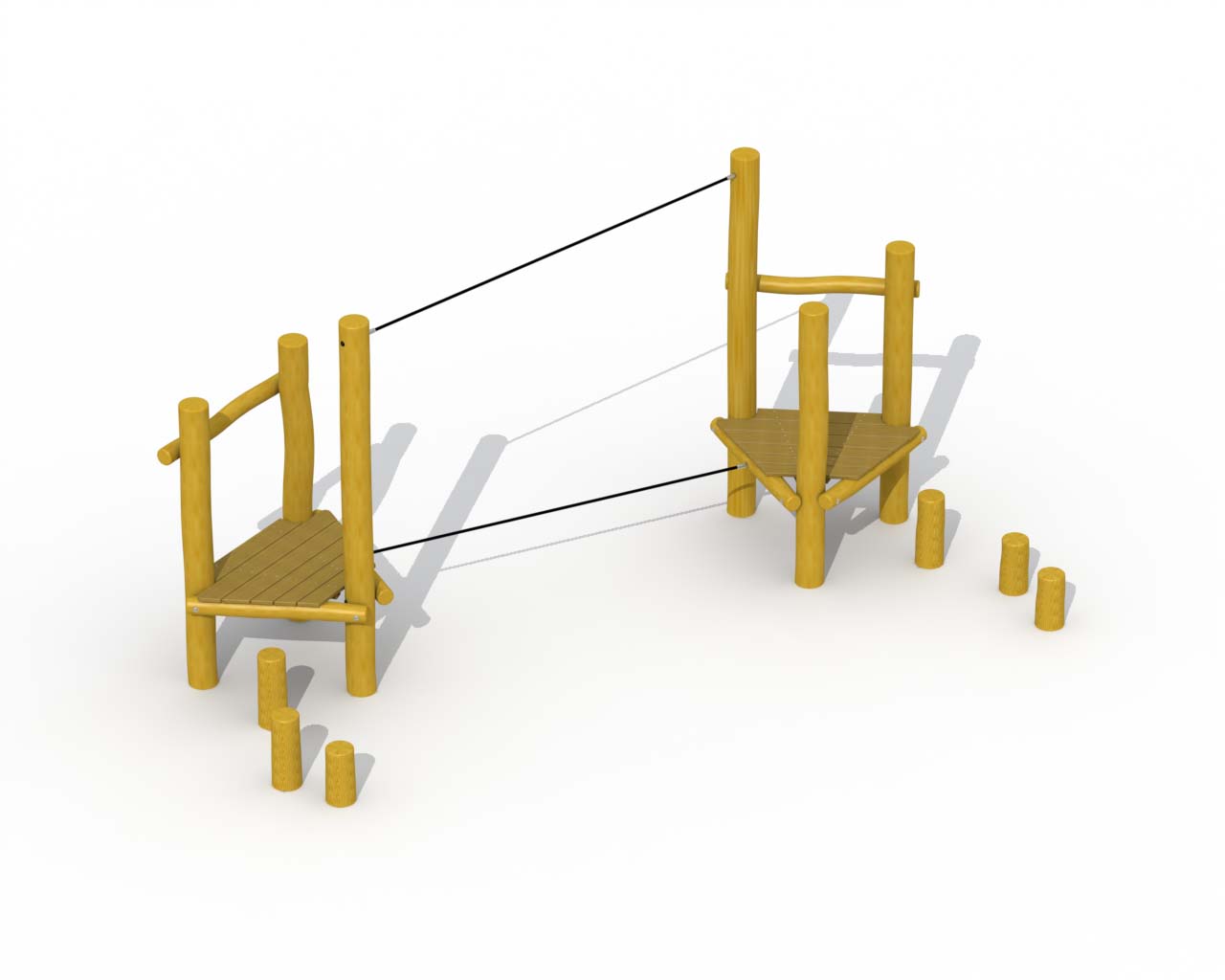 Balansebane i Robinia med balansetau for barn i alderen 3 til 12 år. Lekeutstyret består av 2 plaformer som du kan nå via 3 trappepullerter. Gulvet på plattformen er laget av lerk, resten av lekeutstyret er laget av Robinia. Plattformene er koblet til hverandre via et balansetau laget av stålkabel. Alle muttere og bolter er helt dekket av blomsterformede beskyttelseshetter. Denne konstruksjonen festes direkte i bakken ved bruk av betong.