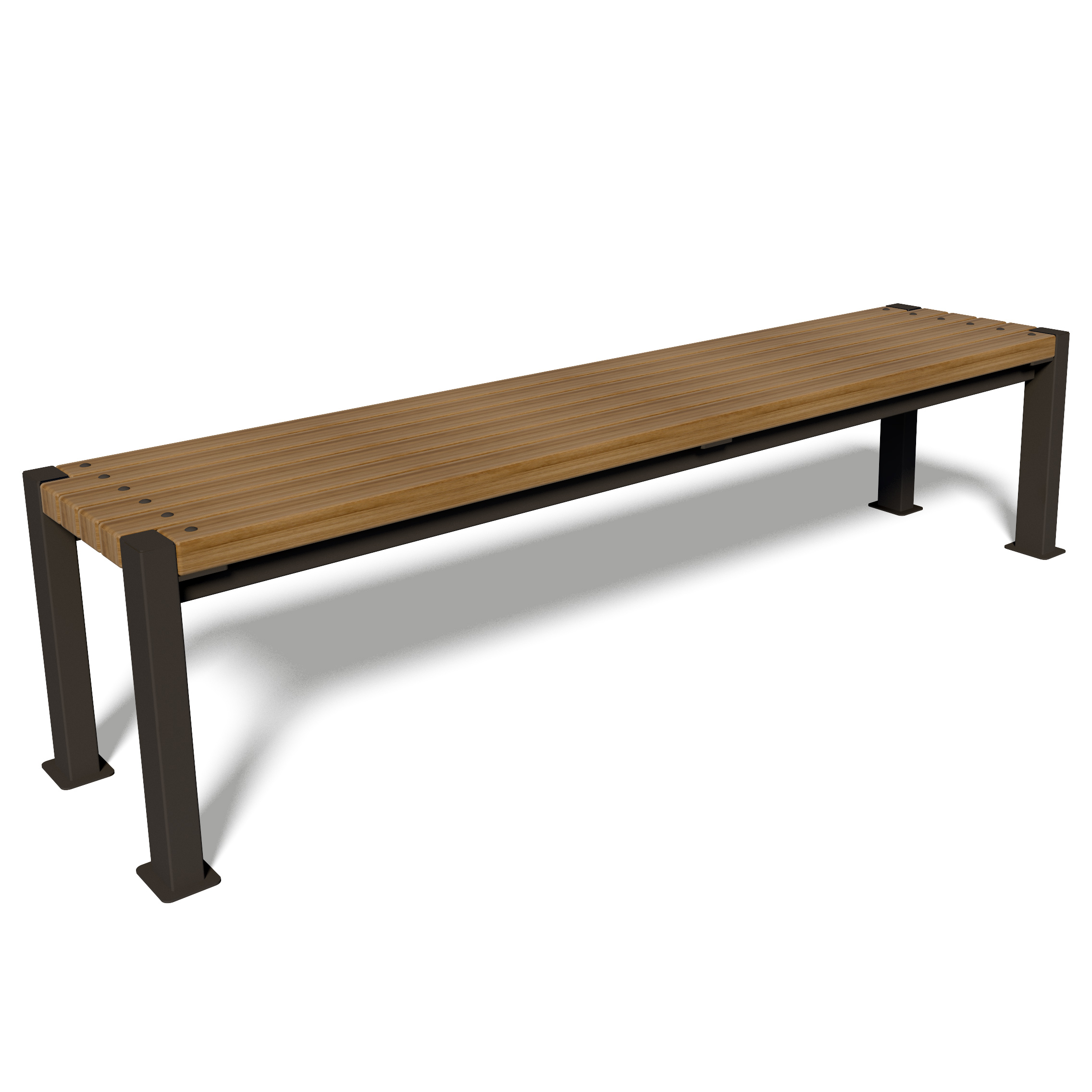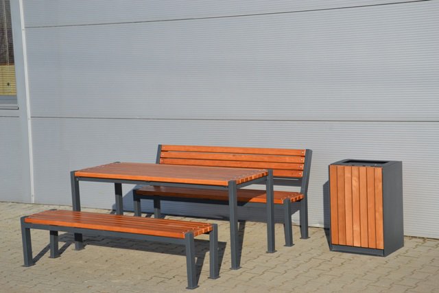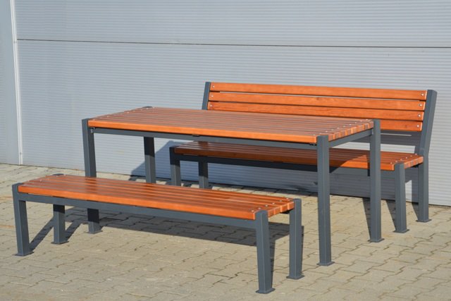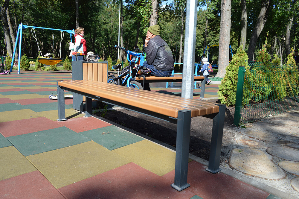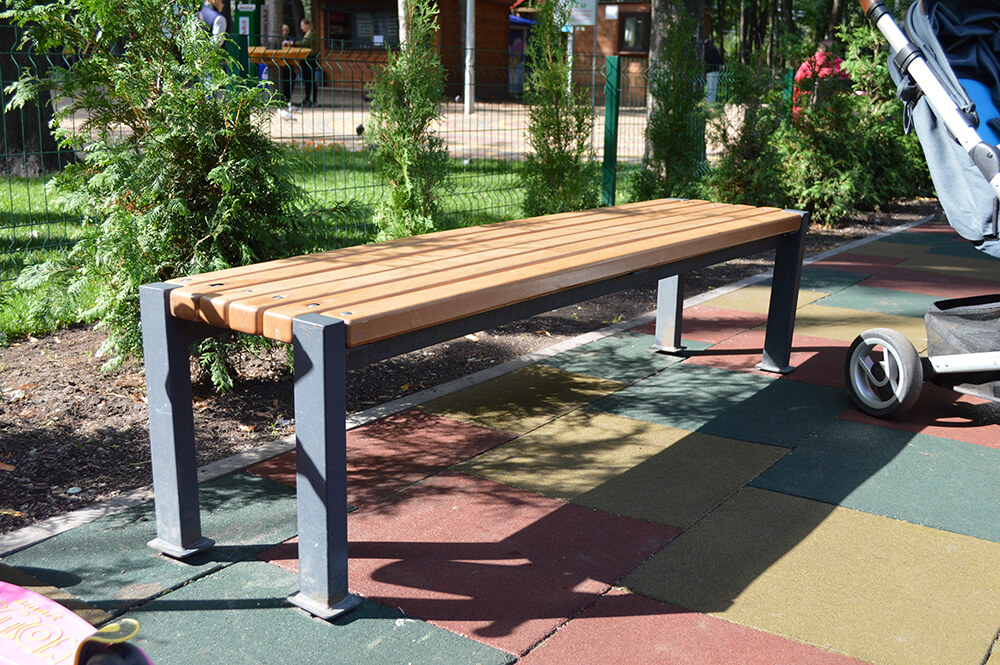 Benken er laget av en høykvalitets stålprofil som tåler 300 kg belastning og treverk. Metalldeler males med pulvermaling, og tredelen – med flere lag lakk, noe som forhindrer aldring av treverket, blokkerer utviklingen av korrosjon og hindrer fuktighet i å slippe gjennom. Benken installeres ved å støpe eller skru.