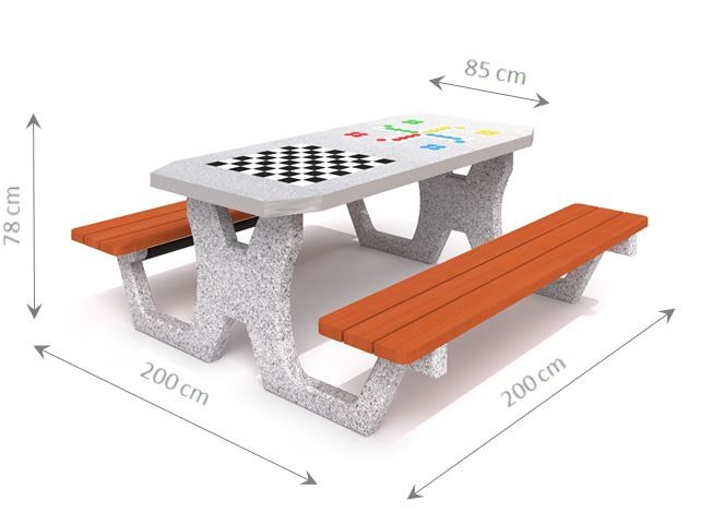 Betongbord for sjakk, dam og ludo-spill med 2 benker. Bordplate (tykkelse 6 cm) laget av polert betong med innbygde gres-fliser. Kanten på toppen er laget av aluminium. På toppen er det et sjakkbrett for sjakk/dam og et brett for ludo-spillet. Seter laget av gran, 4 cm tykke, malt to ganger med lakk på den valgte fargen.