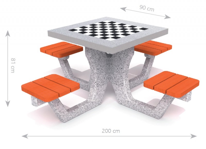 Betongbord for sjakk og dam med 4 seter. Bordplate (tykkelse 6 cm) laget av polert betong med innbygde gres-fliser. Kanten på toppen er laget av aluminium. På toppen er det et sjakkbrett for sjakk/dam. Seter laget av granGran på 4 cm tykkelse, malt to ganger med lakk på valgt farge.