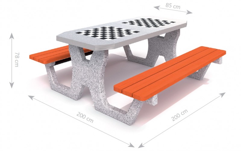 Betongbord for sjakk og dam med 2 benker. Bordplate (tykkelse 6 cm) laget av polert betong med innbygde gres-fliser. Kanten på toppen er laget av aluminium. På toppen er det et sjakkbrett for sjakk/dam. Seter laget av gran, 4 cm tykke, malt to ganger med lakk på den valgte fargen.