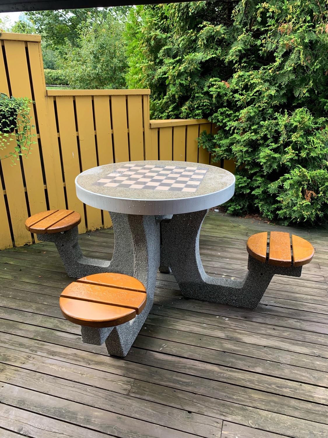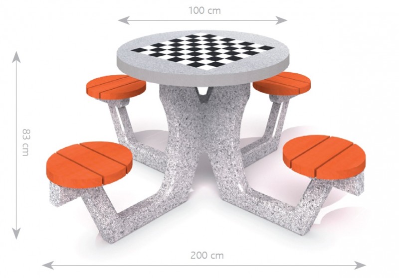 Betongbord for sjakk og dam med 4 seter. Bordplate (tykkelse 6 cm) laget av polert betong med innbygde gres-fliser. Kanten på toppen er laget av aluminium. På toppen er det et brett for ludo-spillet. Seter laget av gran, 4 cm tykke, malt to ganger med lakk på den valgte fargen.