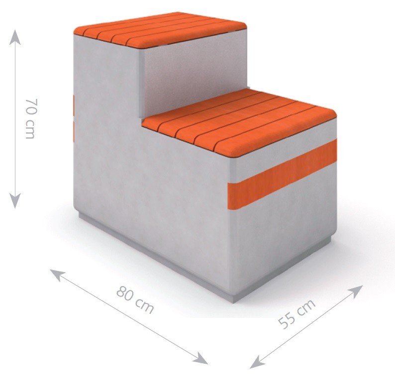 Deco betongbenk finnes i to fargevarianter: HVIT og GRÅ uten ryggstøtte. To nivåer med seter er laget av Gran. Benken beholder det moderne og friske utseendet på bymøbler og urbane rom ved å bruke enkle, lette og glatte betongformer i hånd med Granverk.
