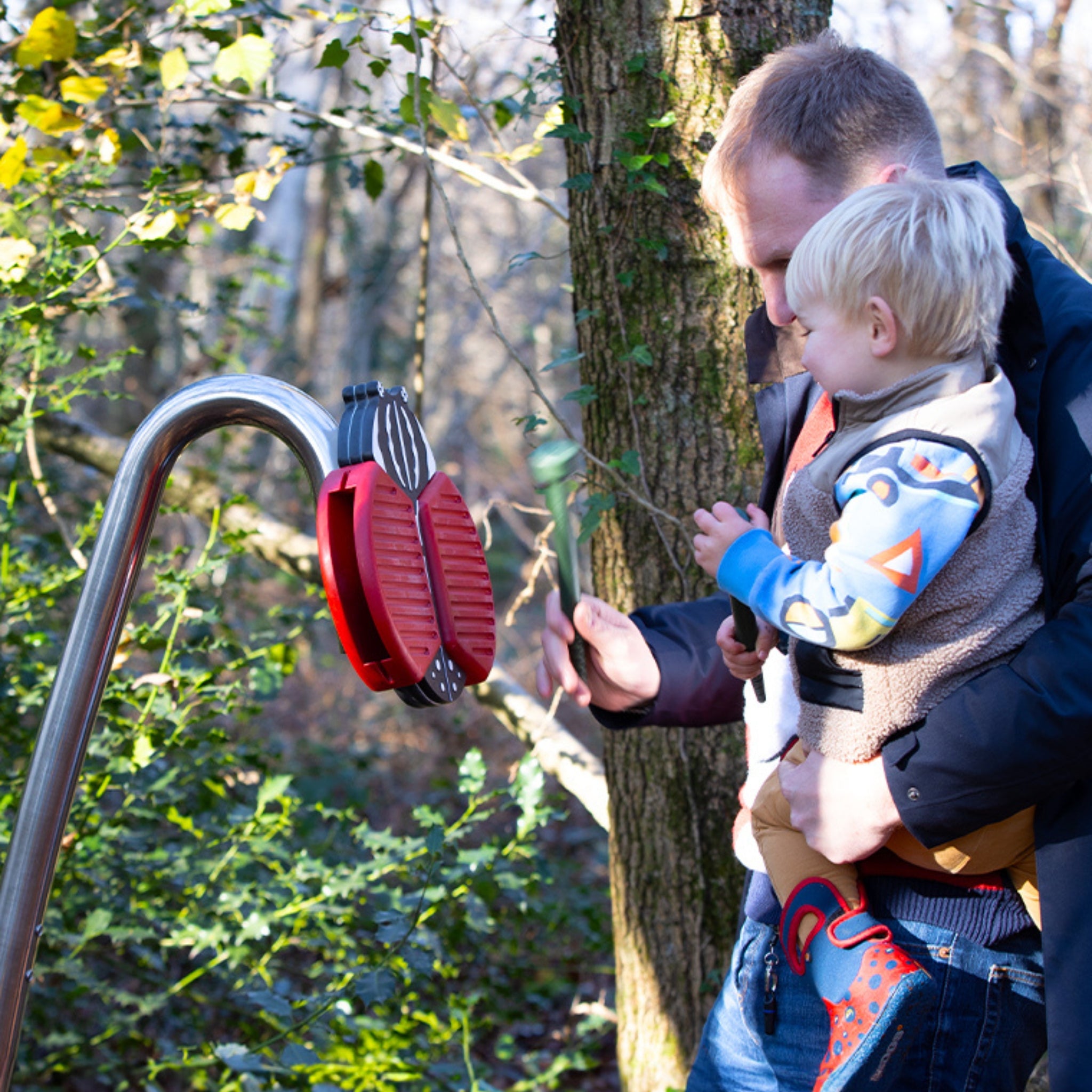Blomsterbillen (stor) er et utendørs musikkinstrument i Insect Beats-familien, utviklet for taktil lek, rytme og sansestimulering i friluft. De brede, rillete «vingene» fungerer som tempelblokker, som lar barna slå med klubben for tydelige toner og skrape for en guiro-lignende tekstur. Den større modellen gir større overflateareal, høyere visuell tilstedeværelse og enkel tilgang for flere mennesker samtidig. Konstruksjonen er bygget for utendørs bruk året rundt med lite vedlikehold, og kan monteres på stolper i rustfritt stål, vegger eller egnet lekeutstyr. Plasser blomsterbillen som et fargerikt fokuspunkt på lekeplassen, skolegården, parken og sansehagen. Det forsterkede hullpolymeret i vingene gir en tydelig respons på både slag og skrubb, slik at barna raskt hører forskjellen i tempo, rytme og tekstur. Den større frontflaten egner seg for tur- og ekkoøvelser, hvor to barn kan leke annenhver gang eller sammen. Som en del av Insect Beats kan Blomsterbillen kombineres med humle, ildflue og øyenstikker for en kompakt musikksone med flere klangfarger. Materialer og overflater velges for daglig utendørsbruk hele året, slik at drift og rengjøring forblir enkel.