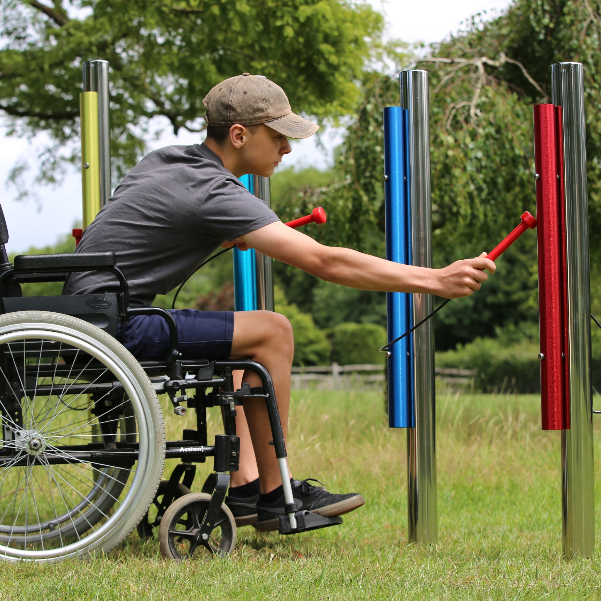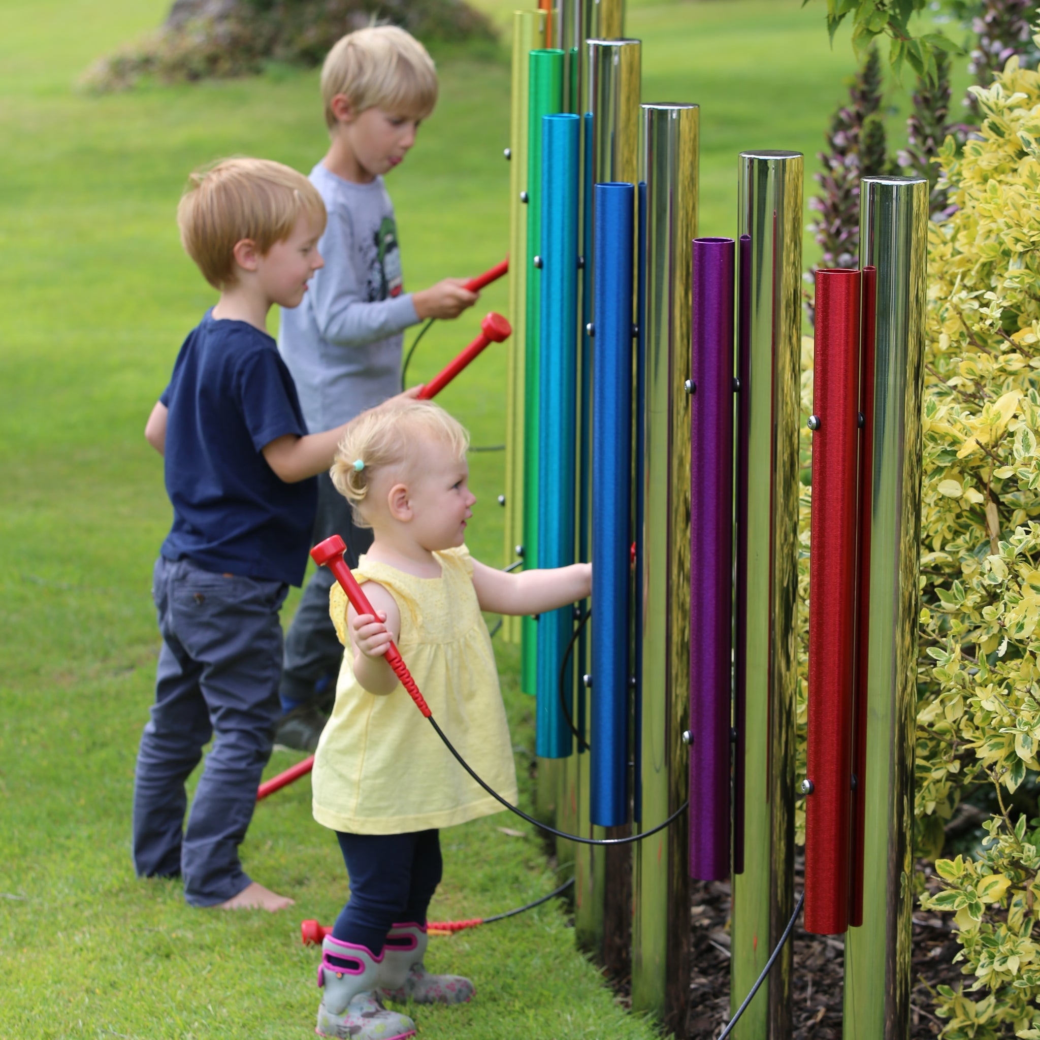Calypso Chimes Diatonic er et sett med utendørs klokkespill med frittstående rør, som gir en klar, lys lyd med lang sustain. Den diatoniske atmosfæren gjør det enkelt å lage enkle melodier og harmonier, slik at både barn og voksne kan leke sammen uten forutsetninger. Instrumentet spilles med køller og egner seg for rolig klang, turtaking og små interaksjoner i friluft. Konstruksjonen er designet for utendørs bruk året rundt med lite vedlikehold. Plasser klokkespill som synlige musikkpunkter på lekeplasser, skolegårder, parker og sansehager, eller kombiner dem med marimba og xylofoner for en større musikksone. Den diatoniske skalaen støtter raske suksessopplevelser og gjør det intuitivt å jobbe med tur-taking, ekko og enkle harmonier. Klokkespill kan stå som et frittstående fokuspunkt eller integreres i melodiske instrumenter og trommer for å skape en variert musikksone. Materialer og overflater er valgt for daglig utendørsbruk året rundt, så rengjøring og drift forblir enkel.