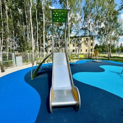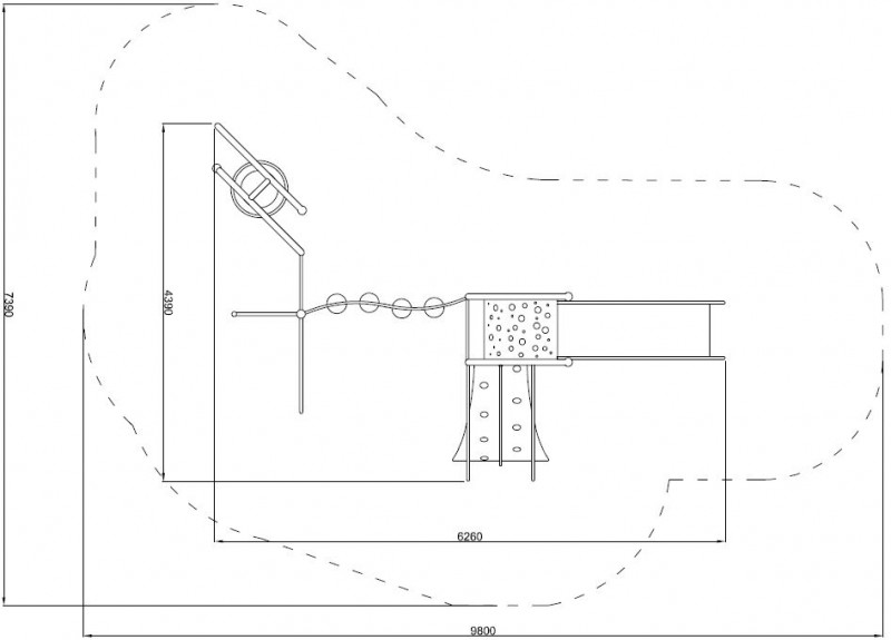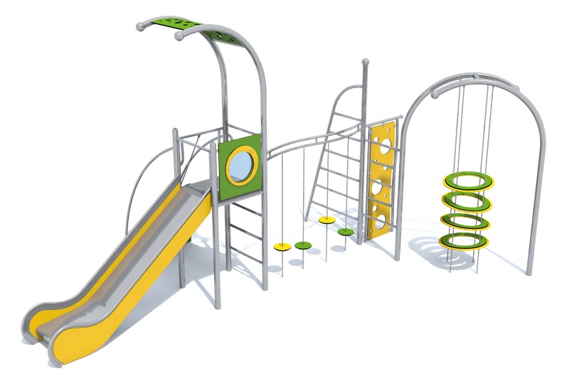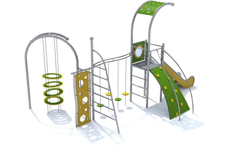 Ett-tårn lekeplass med et snegleinspirert design og et buet åpent tak. Den inkluderer en rett sklie, en bro med hengende kjeder og sirkulære trinn laget av HDPE-brett kalt «regndråper», en inngangsrampe med runde grep, et tau og buede rekkverk, en klatrevegg bestående av fire fleksible ringer som henger på en kjetting, en trekantet klatrevegg og en klatrevegg med runde åpninger. Konstruksjonen er laget av høykvalitets, værbestandig rustfritt stål og er sveiset (klemmer brukes ikke). De bærende rørene (inkludert fire bøyde rør) er ferdigstilt med sfæriske dekorative elementer som ligner snegleantenner. Skyveveggene, klatreveggen, taket og de runde elementene er laget av HDPE-plate, og gulvet er laget av HPL-plate med en sklisikker tekstur for å sikre sikkerhet og forhindre overoppheting i solen og lett frysing om vinteren. Alle rustfrie Limako-produkter er tilgjengelige i galvanisert og pulverlakkert versjon.