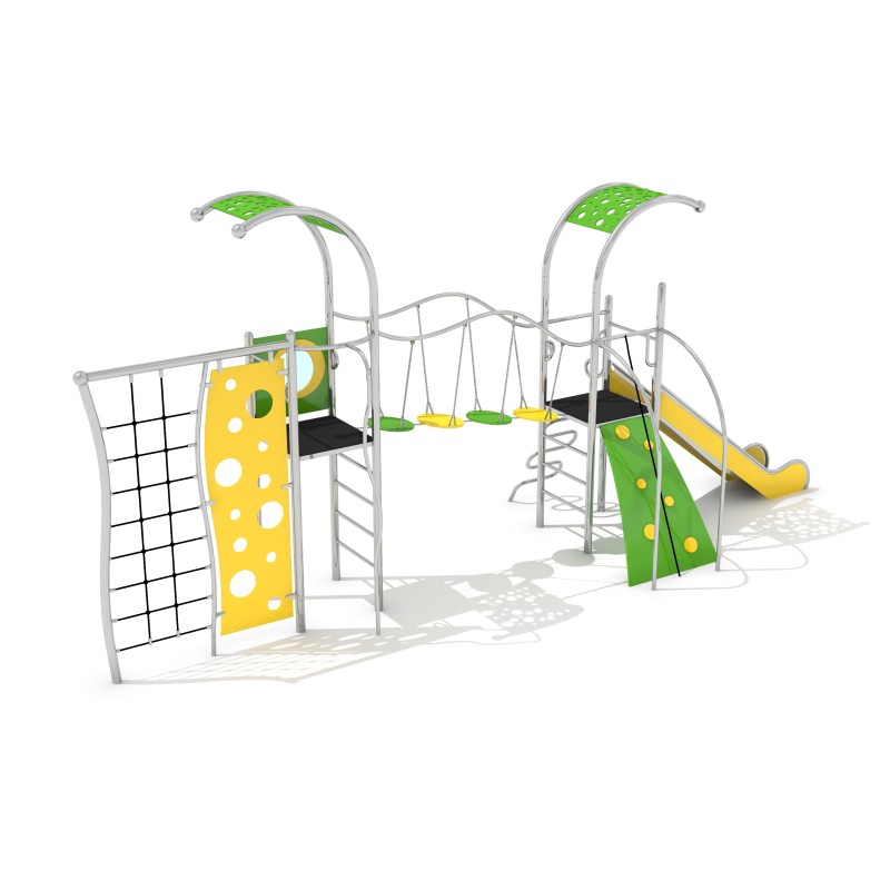 Klatrestativ med stilistikk som refererer til sneglens former og sterke farger. Konstruksjon og slide laget av rustfritt stål som er motstandsdyktig mot værforhold og intensiv bruk. Stolpene avsluttes med baller slik at konstruksjonen ser ut som sneglehorn. Gulvet er laget av HPL med sklisikker tekstur. Takket være denne løsningen er gulvet mykt, trygt, det varmes ikke opp på solrike dager, og det fryser ikke om vinteren.Den fargerike lekeplassen består av to tårn med tak. Alle rustfrie Limako-produkter er tilgjengelige i galvanisert og pulverlakkert versjon.