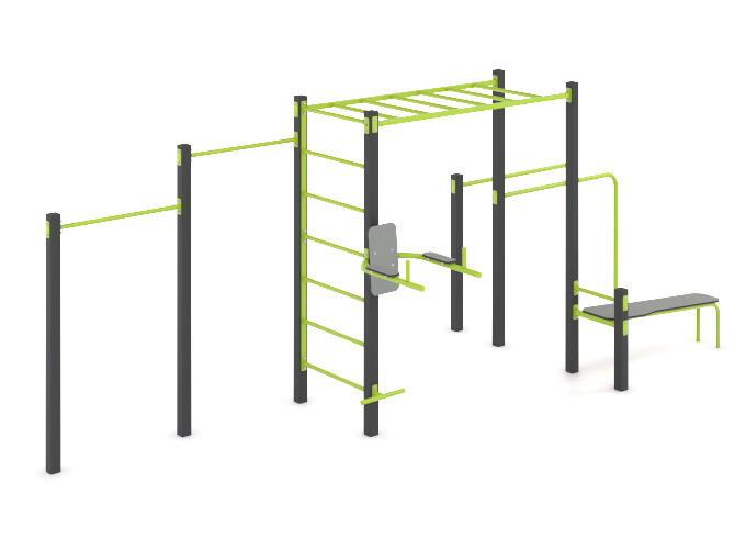 Monkeybar 880 mm – 1 stk. Ribbevegg800 mm – 1 stk. Push Up – 1 stk. Benkpress – 1 stk. Tverrstang 1000 mm – 2 stk. Parallellstenger 1500 mm – 1 par. Velg mellom 12 standard farger på stål og 8 standard farger på HDPE. Andre farger på forespørsel.