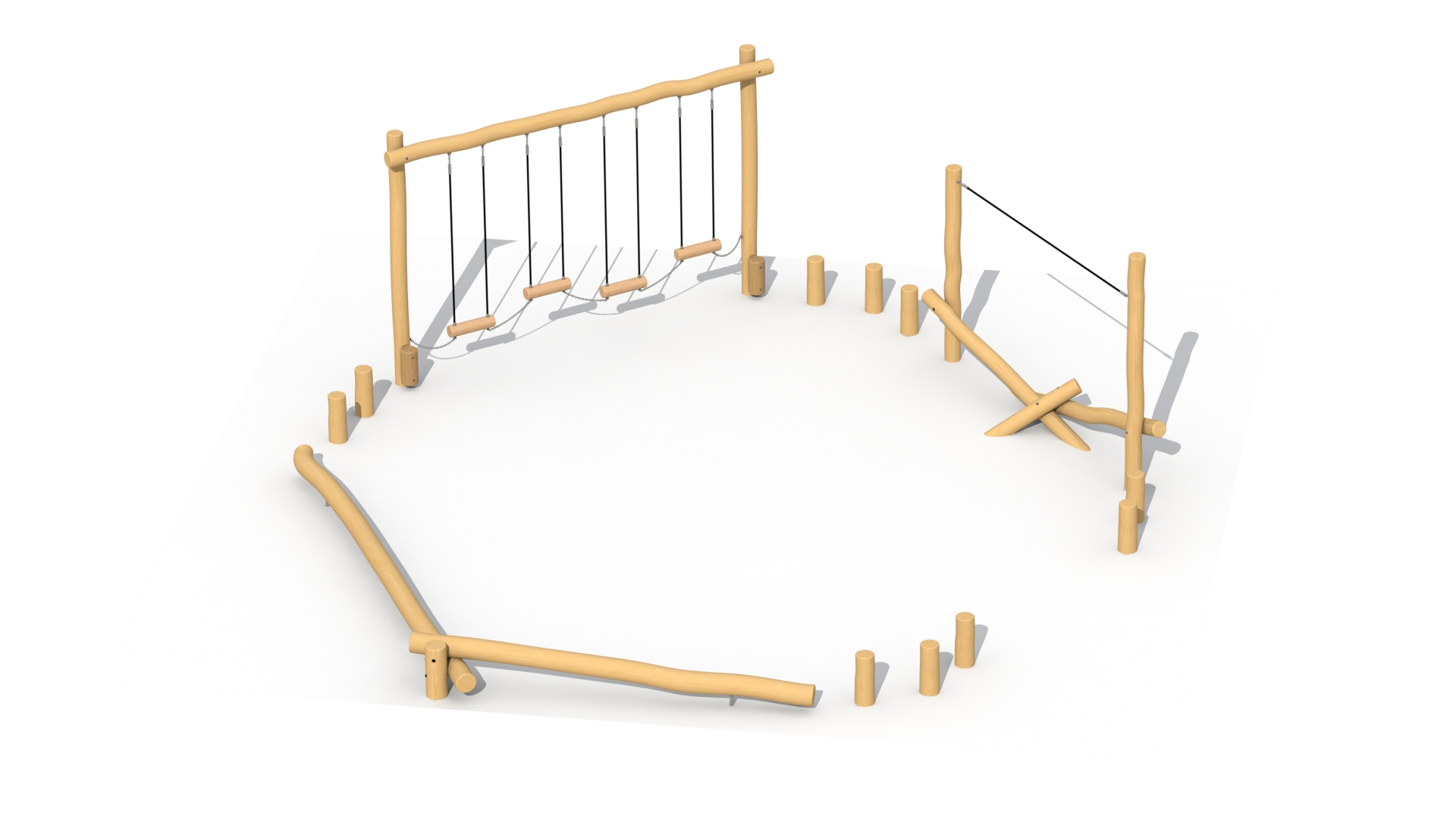 En eventyrlig kombinasjon av: Gaselle (RO366), Leopard (RO367), dobbel balansebom (RO331) og Robinia step-pullerter.