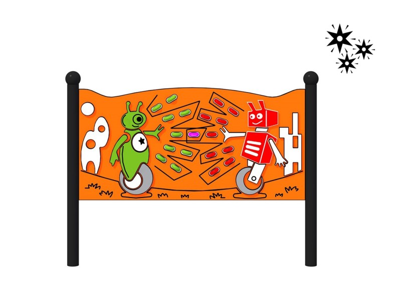 Et stort, glødende sensorisk brett designet for kreativ lek, tilpasset bruk av barn i rullestol. Hovedtemaet har to slåssende roboter som skyter stråler, som består av roterende hjul. Disse hjulene sender ut fargerikt lys når de settes i bevegelse, noe som gjør lekeopplevelsen mer engasjerende. På venstre side av brettet er det en romrakett, mens på høyre side er det et robothus. Nederst på brettet er det spor som imiterer vegetasjon. Strukturen er laget av svart stål, pulverlakkert for holdbarhet. Selve brettet er laget av HDPE-plast. Rørene er ferdige med dekorative sfæriske elementer. LUMO-lekepanel er en ny generasjon lekeplass-serie – innovativ, trygg og full av farger!