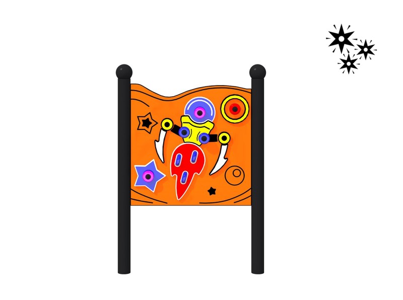 Et glødende sensorisk brett designet for kreativ lek, tilpasset bruk av barn i rullestol. Hovedtemaet på brettene er en rakett og stjerner. Brettet har roterende hjul som sender ut fargerikt lys når det settes i bevegelse, noe som gjør leken mer engasjerende. Strukturen er laget av svart, galvanisert, pulverlakkert stål. Selve brettene er laget av HDPE-materiale. Rørene er ferdige med sfæriske dekorative elementer.