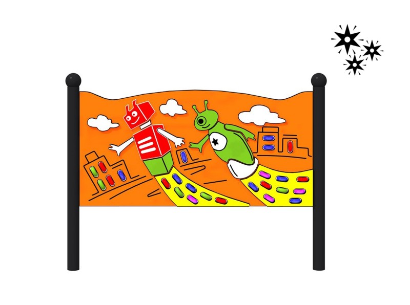 Et stort, glødende sensorisk brett designet for kreativ lek, tilpasset bruk av barn i rullestol. Hovedtemaet har to flyvende roboter i livlige røde og grønne farger. De roterende hjulene sender ut fargerike lys når de er i bevegelse, noe som gjør leken mer engasjerende og spennende. Bakgrunnen har spor som etterligner bygninger og skyer, og forbedrer det fantasifulle miljøet. Strukturen er laget av svart, galvanisert og pulverlakkert stål for holdbarhet. Selve bretten er konstruert av HDPE-materiale, og rørene er ferdige med dekorative sfæriske elementer. LUMO-lekepanel er en ny generasjon lekeplass-serie – innovativ, trygg og full av farger!