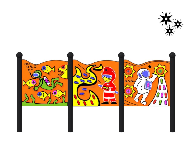 Sett med tre sammenkoblede, glødende sensoriske paneler er et innovativt rom for interaktiv lek, designet med tanke på barn, inkludert de som bruker rullestol. Takket være forskjellige teksturer, levende farger og engasjerende elementer stimulerer panelene sansene, forbedrer kognitive evner og vekker barns fantasi. Hovedpersonene i Sett er en dykker, en brannmann og en astronaut – som inspirerer barn til å utforske nye verdener! De innebygde roterende hjulene avgir fargerikt lys når de settes i bevegelse, noe som gjør leken enda mer spennende. Strukturen er laget av svart stål, galvanisert og pulverlakkert. Panelet er laget av HDPE-materiale. Rørene er ferdige med sfæriske dekorative elementer. LUMO-lekepanel er en ny generasjon lekeplass-serie – innovativ, trygg og full av farger!
