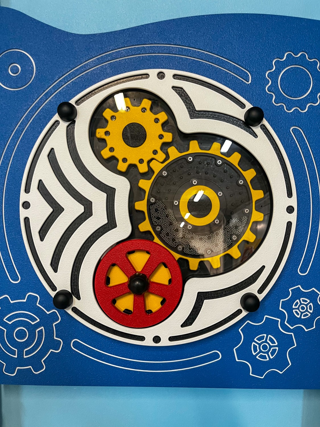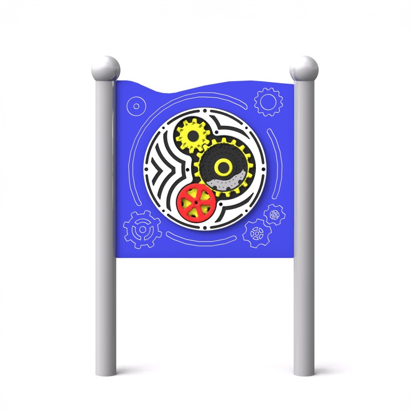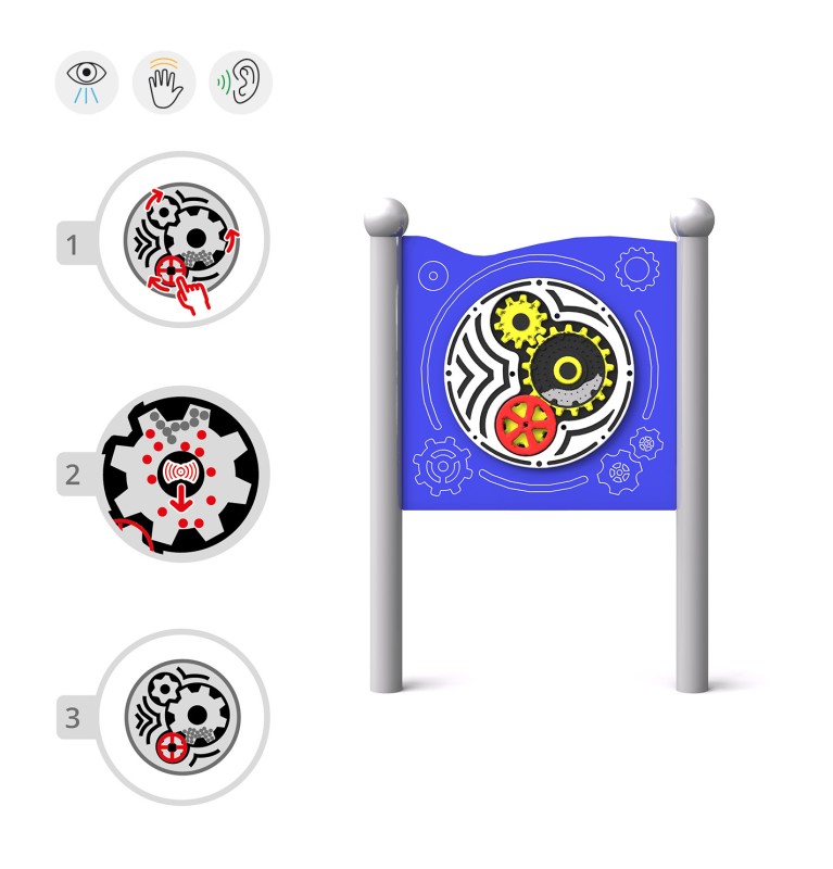 Et sensorisk brett for kreativ lek med en lyd som øker kreativiteten og sanseopplevelsen til barn, inkludert de i rullestol. Med et panel bestående av tre lett roterbare, bevegelige tannhjul, gir denne enheten uendelige muligheter for fantasifull lek og utforskning.