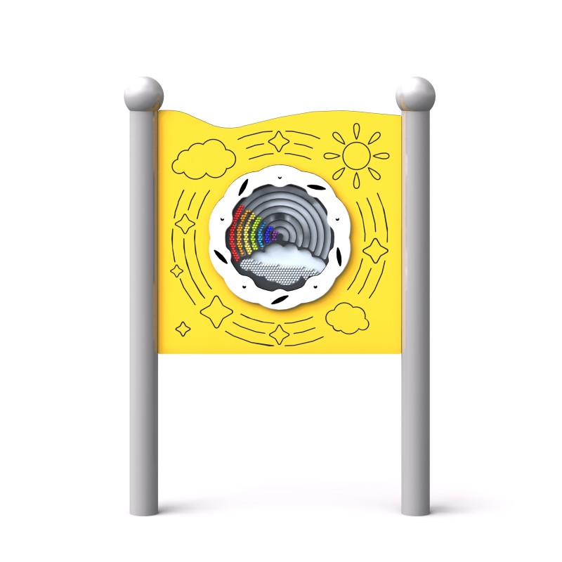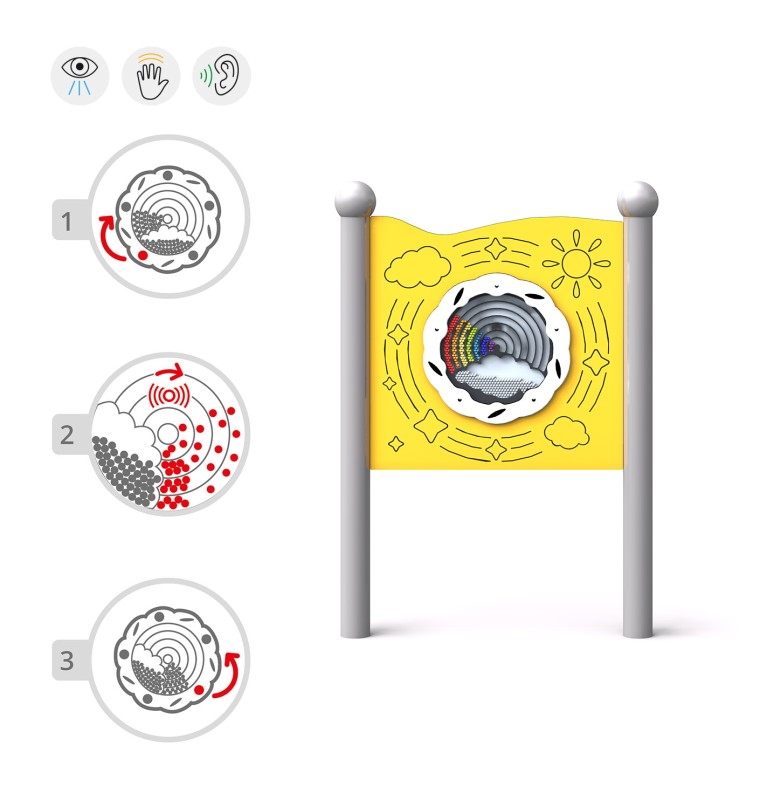 Et sensorisk brett for kreativ lek med en lyd som øker kreativiteten og sanseopplevelsen til barn, inkludert de i rullestol. Enheten har et hjul som roterer jevnt og uanstrengt, pyntet med hundrevis av plastkuler i UV-stabile nyanser av regnbue- og skyfarger.