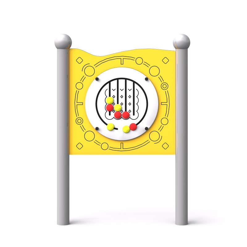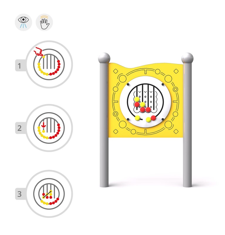 Et sensorisk brett for kreativ lek med en lyd som øker kreativiteten og sanseopplevelsen til barn, inkludert de i rullestol. Den har et panel med runde elementer som kan flyttes langs bestemte spor i ulike retninger, noe som gir en interaktiv og stimulerende opplevelse.