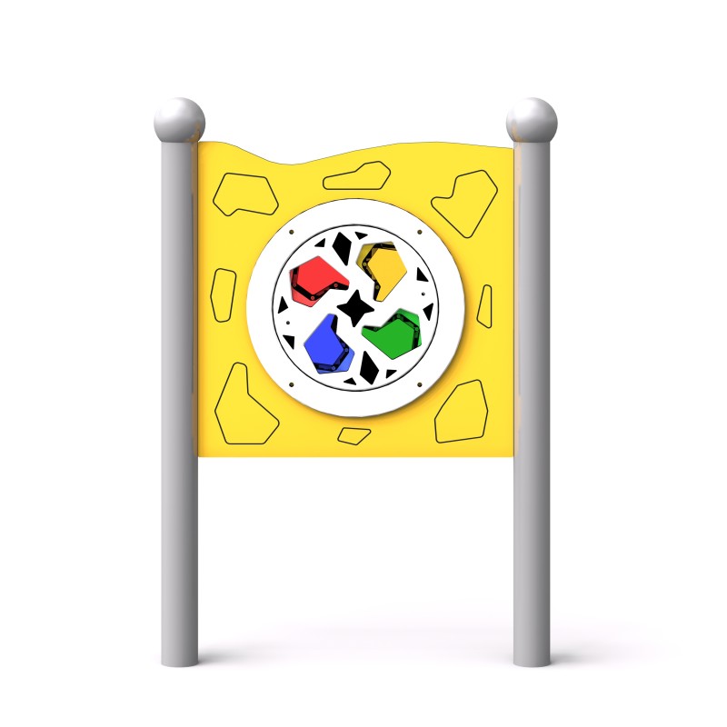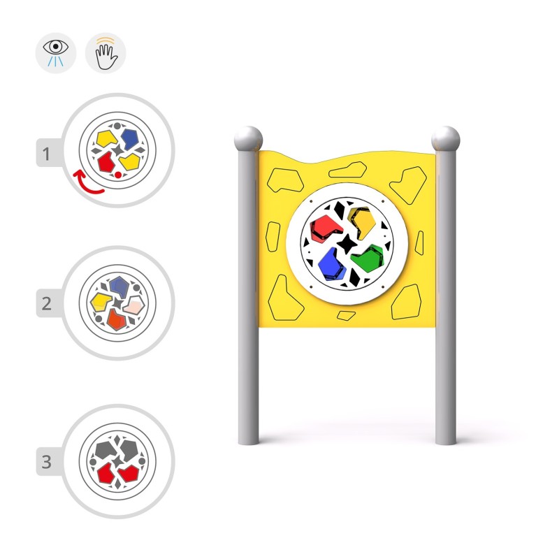 Et sensorisk brett for kreativ lek med en lyd som øker kreativiteten og sanseopplevelsen til barn, inkludert de i rullestol. Den har et raskt roterende hjul med fire fargerike, kaleidoskoplignende vinduer, som gir en fengslende visuell og taktil opplevelse.
