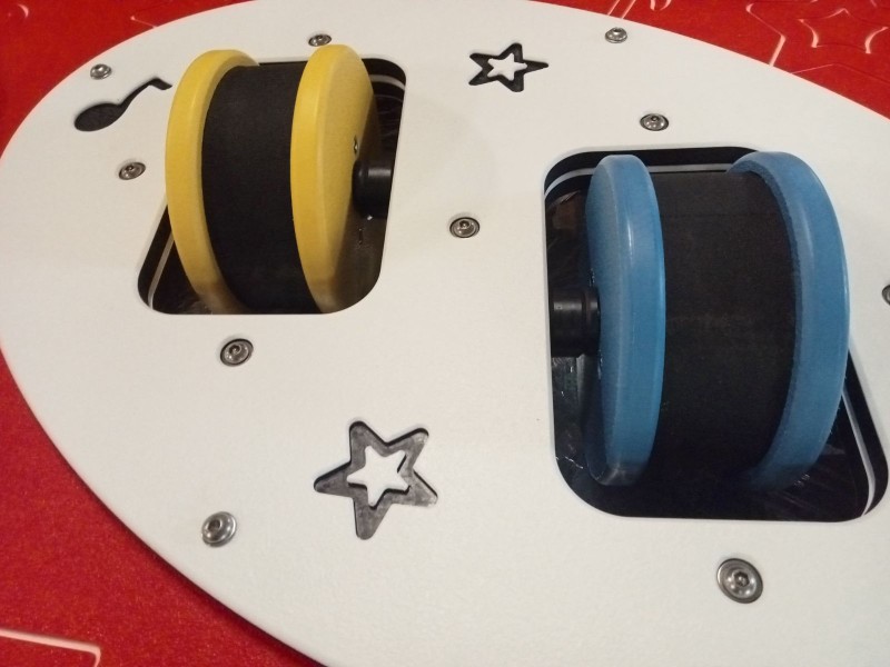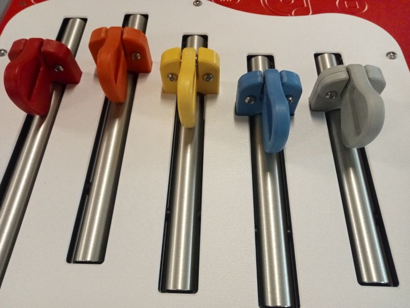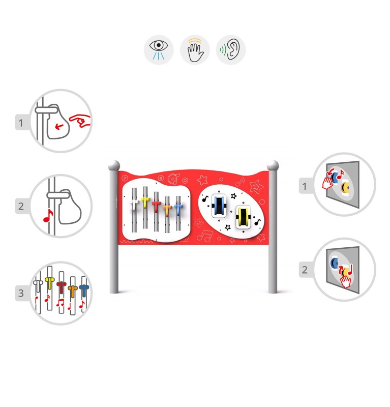 En dobbel sensorisk tavle for kreativ lek med en lyd som øker kreativiteten og sanseopplevelsen til barn, inkludert de i rullestol. Utstyret har to paneler: det første panelet har fem pipeklokker som gir fra seg utmerket lyd og er fargekodet, slik at de kan spilles som et musikkinstrument ved hjelp av fargekoordinering. Det andre panelet inkluderer to fargerike trommer som skaper lyden av maracas, og tilfører et morsomt og engasjerende element til den musikalske opplevelsen.