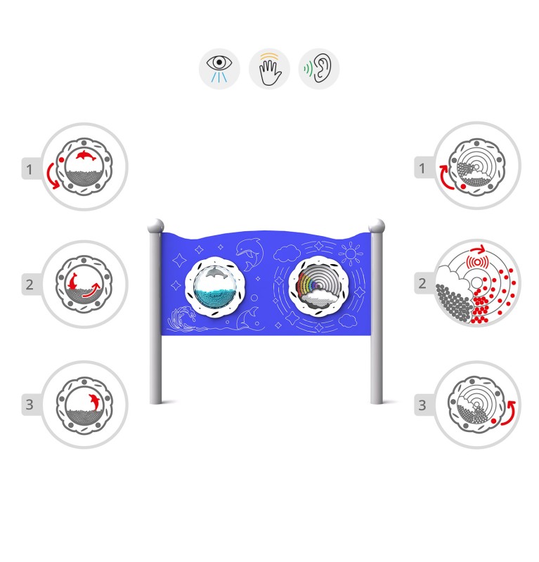 Et dobbelt sensorisk brett for kreativ lek med en lyd som forsterker kreativiteten og sanseopplevelsen til barn, inkludert de i rullestol. Utstyret har to paneler: ett med et raskt roterende hjul med 100-talls regnbue- og skyfargede UV-stabile plastballer, og det andre med en roterende trommel med dykkende og hoppende delfin bestående av hundrevis av plastballer.