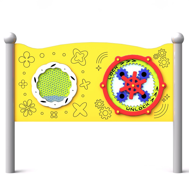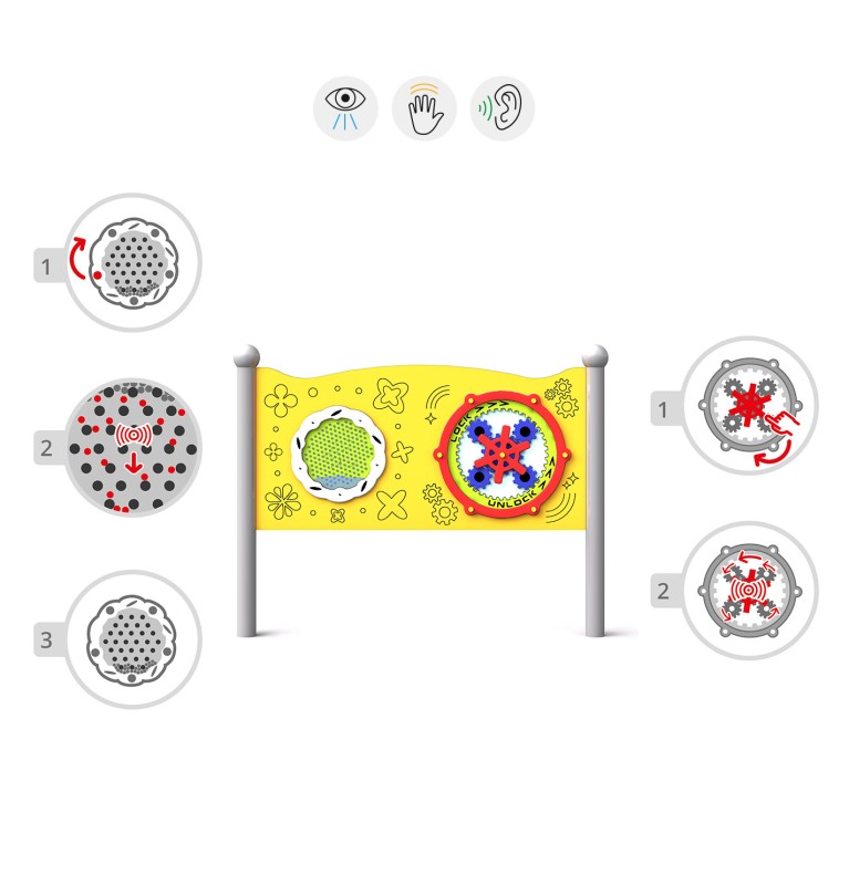 En dobbel sensorisk tavle for kreativ lek med en lyd som øker kreativiteten og sanseopplevelsen til barn, inkludert de i rullestol. Utstyret har to paneler: ett med et raskt roterende interaktivt panel med tannhjul inni, og ett med kuler i rustfritt stål som tumler gjennom pinnene mens du spinner platen, og lager en vakker lyd.