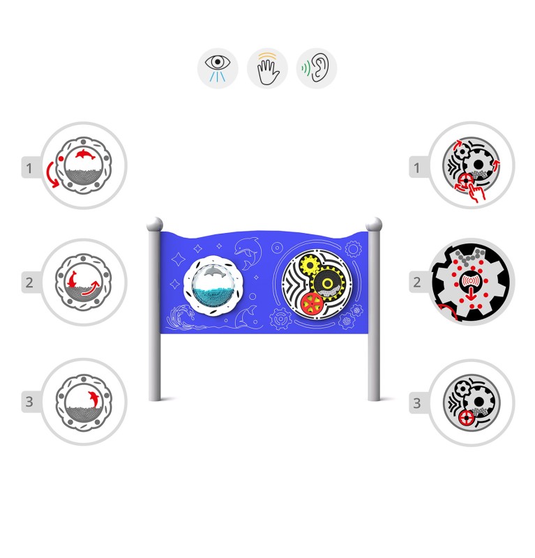 En dobbel sensorisk tavle for kreativ lek med en lyd som øker kreativiteten og sanseopplevelsen til barn, inkludert de i rullestol. Utstyret har to paneler: ett med tre lett roterbare bevegelige tannhjul og ett roterende trommel med dykkende og hoppende delfin bestående av hundrevis av blå UV-stabile plastkuler.