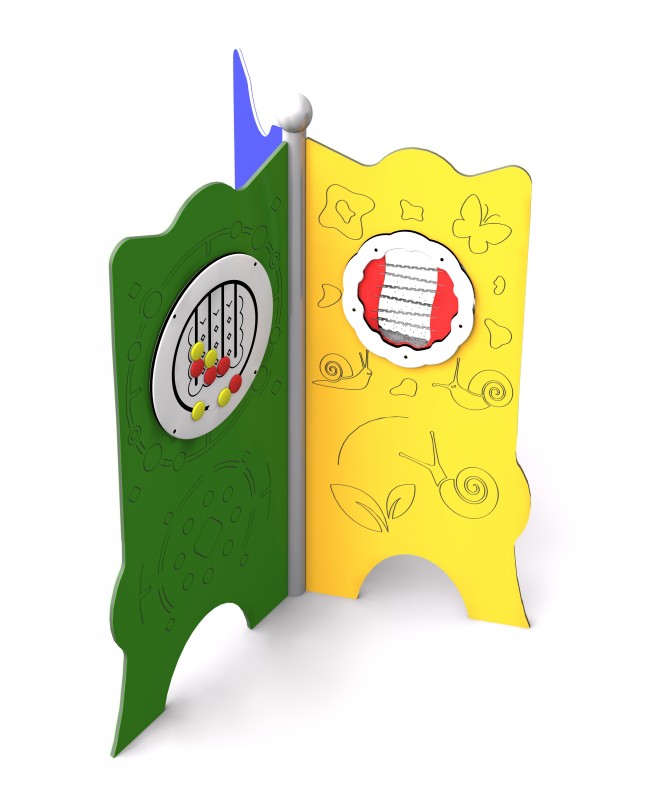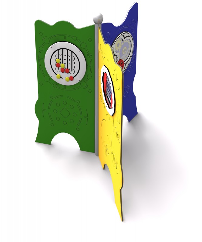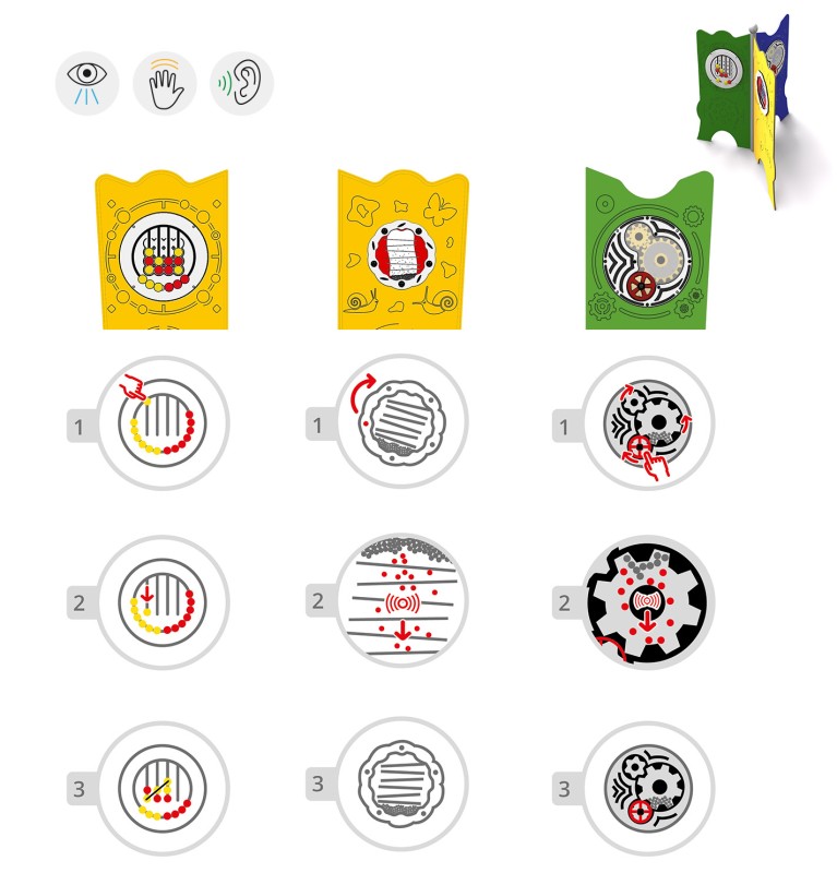 En trippel sensorisk tavle for kreativ lek med en lyd som øker kreativiteten og sanseopplevelsen til barn, inkludert de i rullestol. Utstyret har tre paneler: ett med runde elementer som kan beveges langs de angitte skinnene i ulike retninger, ett med et roterende hjul som lager regnlyden når det svinges, og ett med tre lett roterbare bevegelige gir.