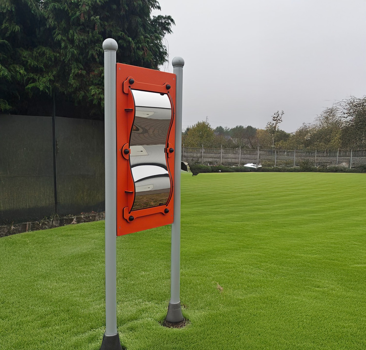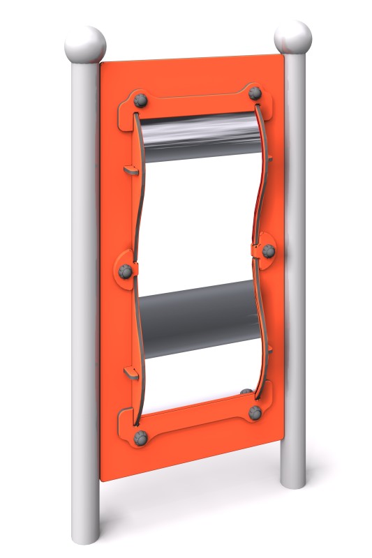 Et sansetavle designet for kreativ lek, tilpasset for bruk av barn i rullestol. Leketøyet har et buet speil (bølgete, forvrengt) som ikke bare underholder, men også oppmuntrer til interaksjon og støtter barnets sanseutvikling.