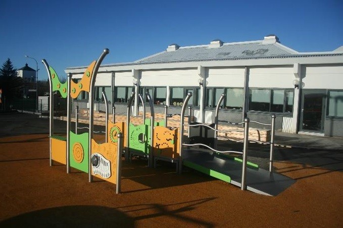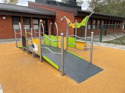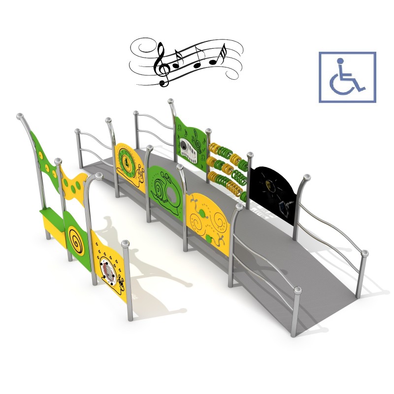 Multifunksjonssett for rullestolbrukere med musikkpaneler. Konstruksjon laget av rustfritt stål. Musikkpaneler i fargene gul og grønn.