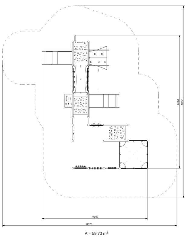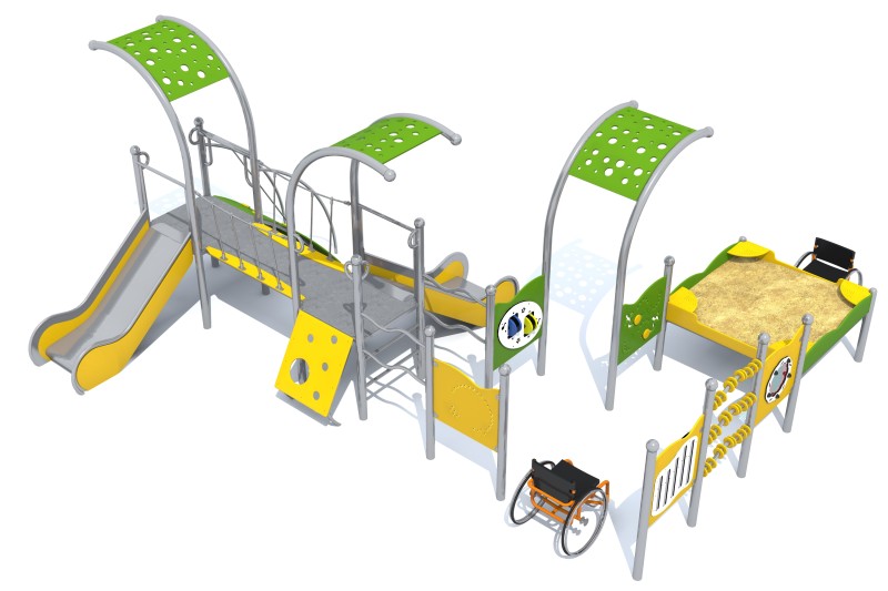 Et integrert sett med livlige farger bestående av to tårn med gittertak og to sklier, en inngangsrampe med tau og rekkverk for klatring, en skråstilt klatrevegg med hull, en spiralformet inngangsstige, et sansebrett med to fargerike trommer som produserer maraca-lyder, et sansebrett med fem rørformede klokkespill som produserer lyd, et sansebrett med et roterende hjul som produserer regnlyder, et sansebrett med en klokke, et sansebrett med skyveelementer, en kuleramme og en sandkasse med skjermer. Settet har en sneglelignende designestetikk.