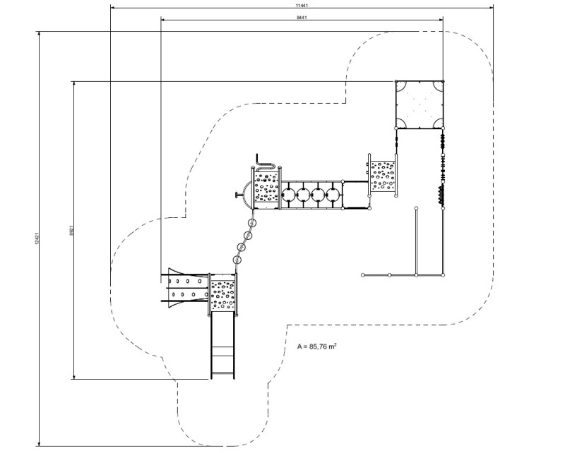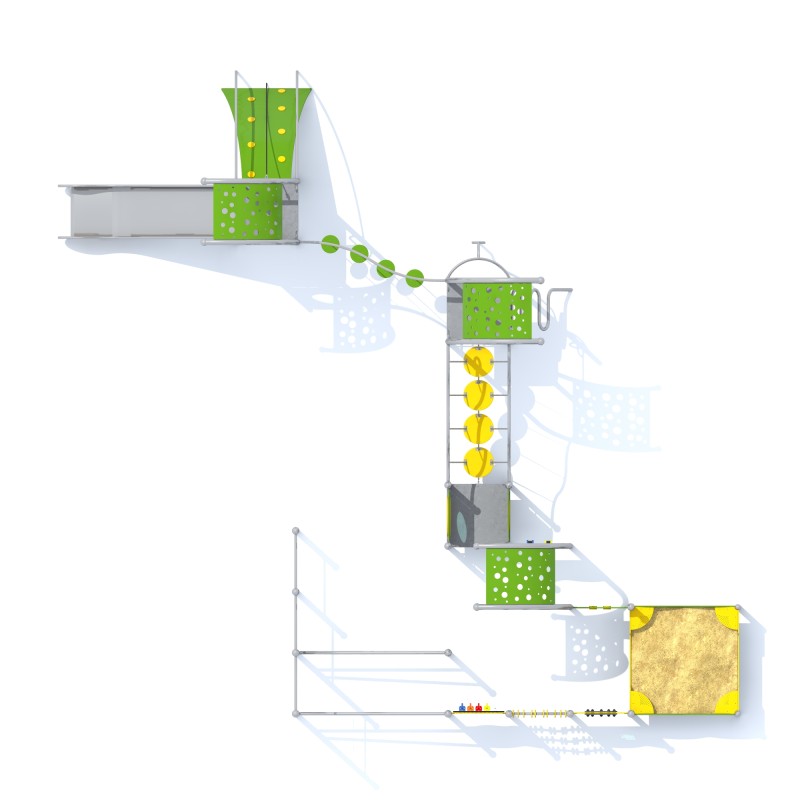 Et integrert sett i livlige farger bestående av tre tårn, hvorav ett har en sklie, en inngangsrampe med tau, to broer, en pioner, inngangsstiger, et sansebrett med to fargerike trommer som produserer maraca-lyder, et sansebrett med fem rørformede klokkespill som produserer lyd, et sansebrett med et roterende hjul som produserer regnlyder, et sansebrett med glidende elementer, en kuleramme og en sandkasse. Settet har en designestetikk inspirert av formen på en snegle.