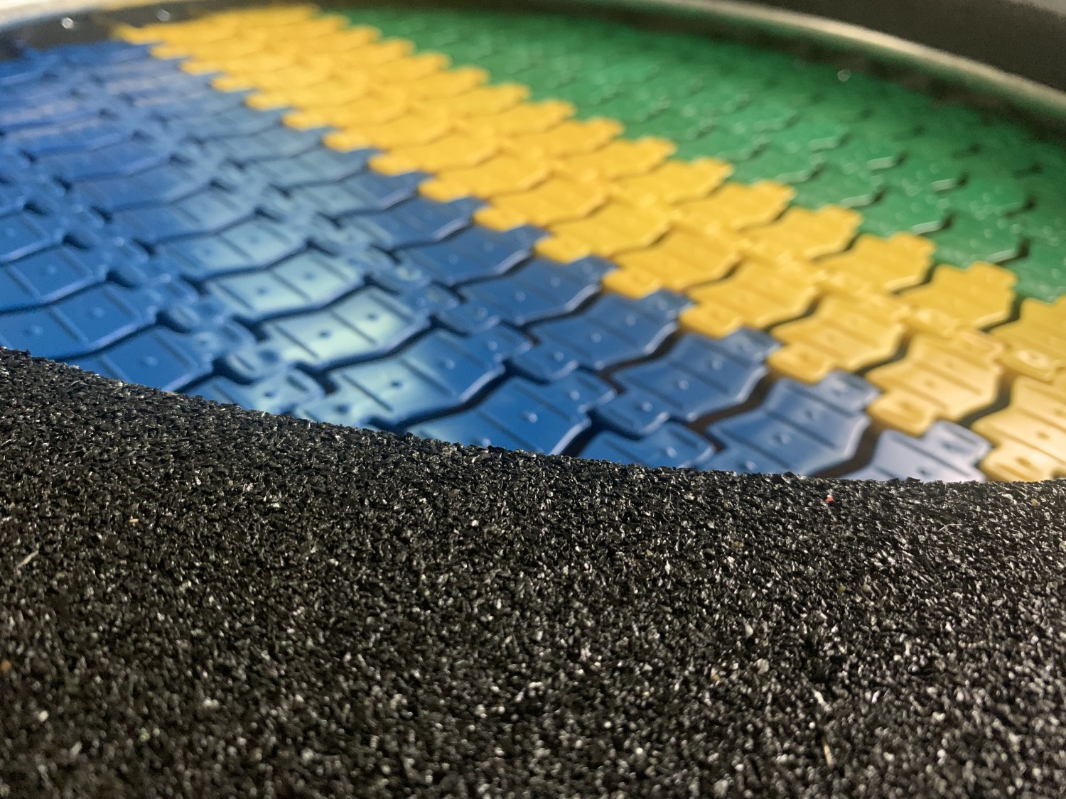 Rund trampoline beregnet for bruk på lekeplasser med intensiv bruk. Hoppematten er laget av svært holdbare Hercules-lameller med en bredde på minst 37 mm, med formen til bokstaven «V» og forsterket med ribber. Takket være den unike formen på lamellene er mellomrommene mellom matteelementene redusert til bare 7 mm, noe som hindrer små gjenstander, som nøkler eller mobiltelefoner, i å falle ned i trampolinen. Matten er tilgjengelig i 8 farger, og det er også mulig å lage grafikk på matten. Gummitrampolinekragen er tilgjengelig i 2 standardfarger og 23 spesialfarger. I tillegg kan et dekorativt mønster lages på kragen. Trampolinen kan utstyres med oppklappbart trekk som gjør det enkelt å rengjøre innvendig. Trampoline med sort eller rød krage (SBR gummi) Hoppeflate: 150cm