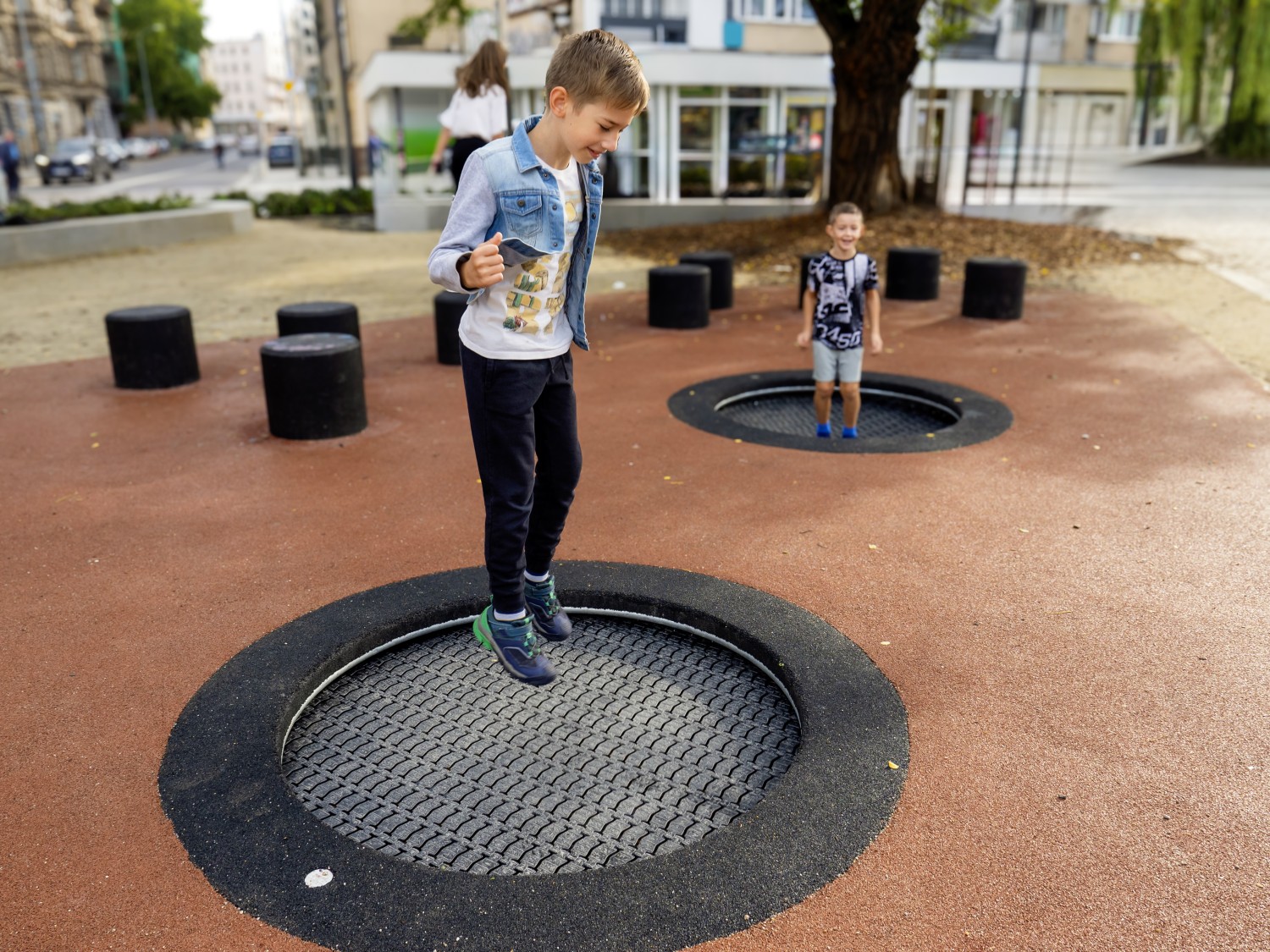 Sett med 3 trampoliner beregnet for bruk på lekeplasser med intensiv bruk. Settet består av 3 runde trampoliner. Hoppematten er laget av svært holdbare Hercules-lameller med en bredde på minst 37 mm, med formen til bokstaven «V» og forsterket med ribber. Takket være den unike formen på lamellene er mellomrommene mellom matteelementene redusert til bare 7 mm, noe som hindrer små gjenstander, som nøkler eller mobiltelefoner, i å falle ned i trampolinen. Matten er tilgjengelig i 8 farger, og det er også mulig å lage grafikk på matten. Gummitrampolinekragen er tilgjengelig i 2 standardfarger og 23 spesialfarger. I tillegg kan et dekorativt mønster lages på kragen. Trampolinen kan utstyres med oppklappbart trekk som gjør det enkelt å rengjøre innvendig. Med sort eller rød krage (SBR-gummi)