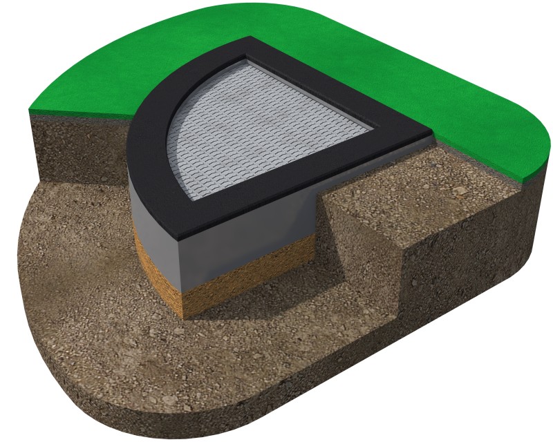 Kvartformet trampoline beregnet for bruk på lekeplasser med intensiv bruk. Hoppematten er laget av svært holdbare Hercules-lameller med en bredde på minst 37 mm, med formen til bokstaven «V» og forsterket med ribber. Takket være den unike formen på lamellene er mellomrommene mellom matteelementene redusert til bare 7 mm, noe som hindrer små gjenstander, som nøkler eller mobiltelefoner, i å falle ned i trampolinen. Matten er tilgjengelig i 8 farger, og det er også mulig å lage grafikk på matten. Gummitrampolinekragen er tilgjengelig i 2 standardfarger og 23 spesialfarger. I tillegg kan et dekorativt mønster lages på kragen. Trampolinen kan utstyres med oppklappbart trekk som gjør det enkelt å rengjøre innvendig. Trampoline med sort eller rød krage (SBR gummi)