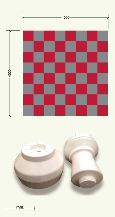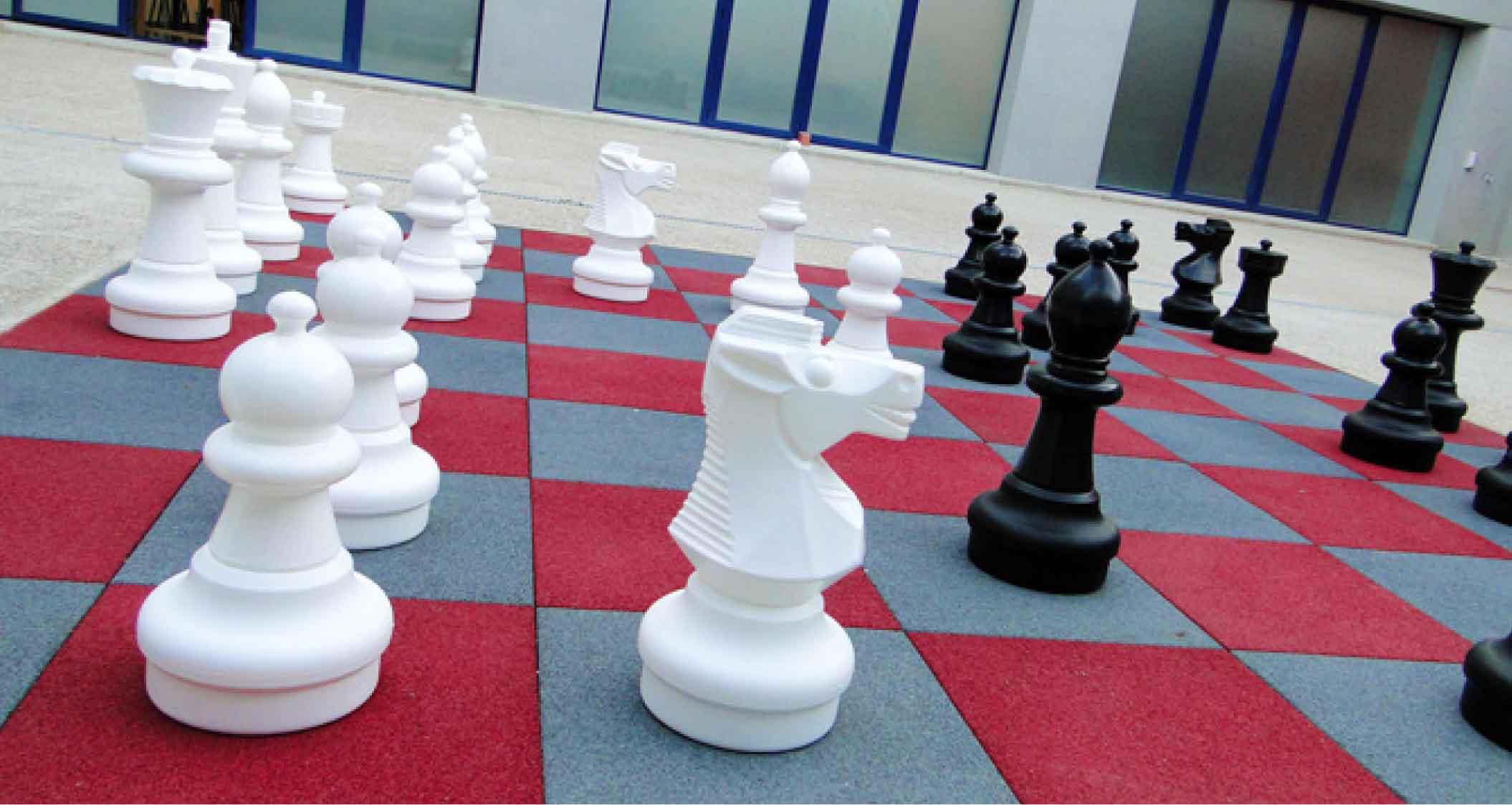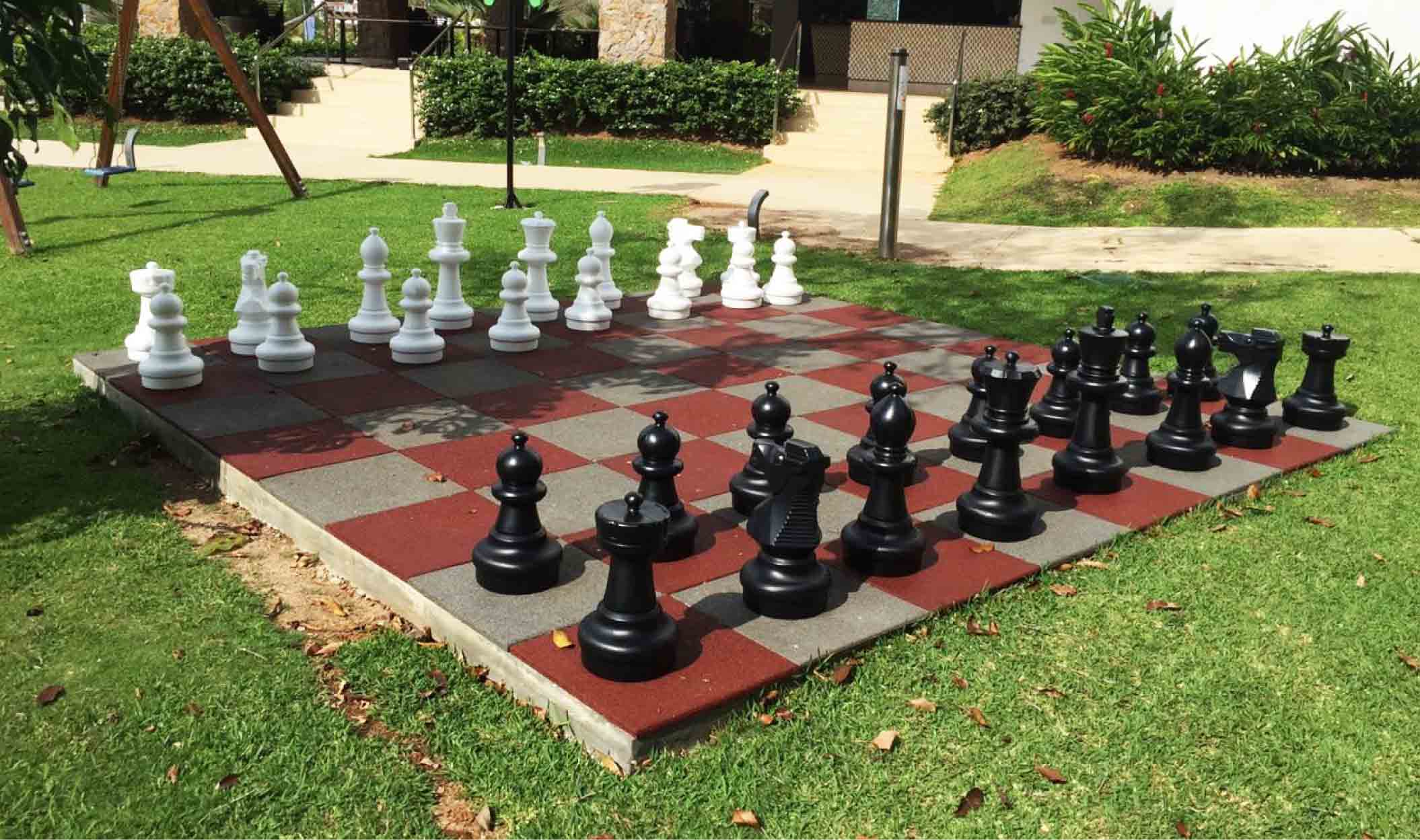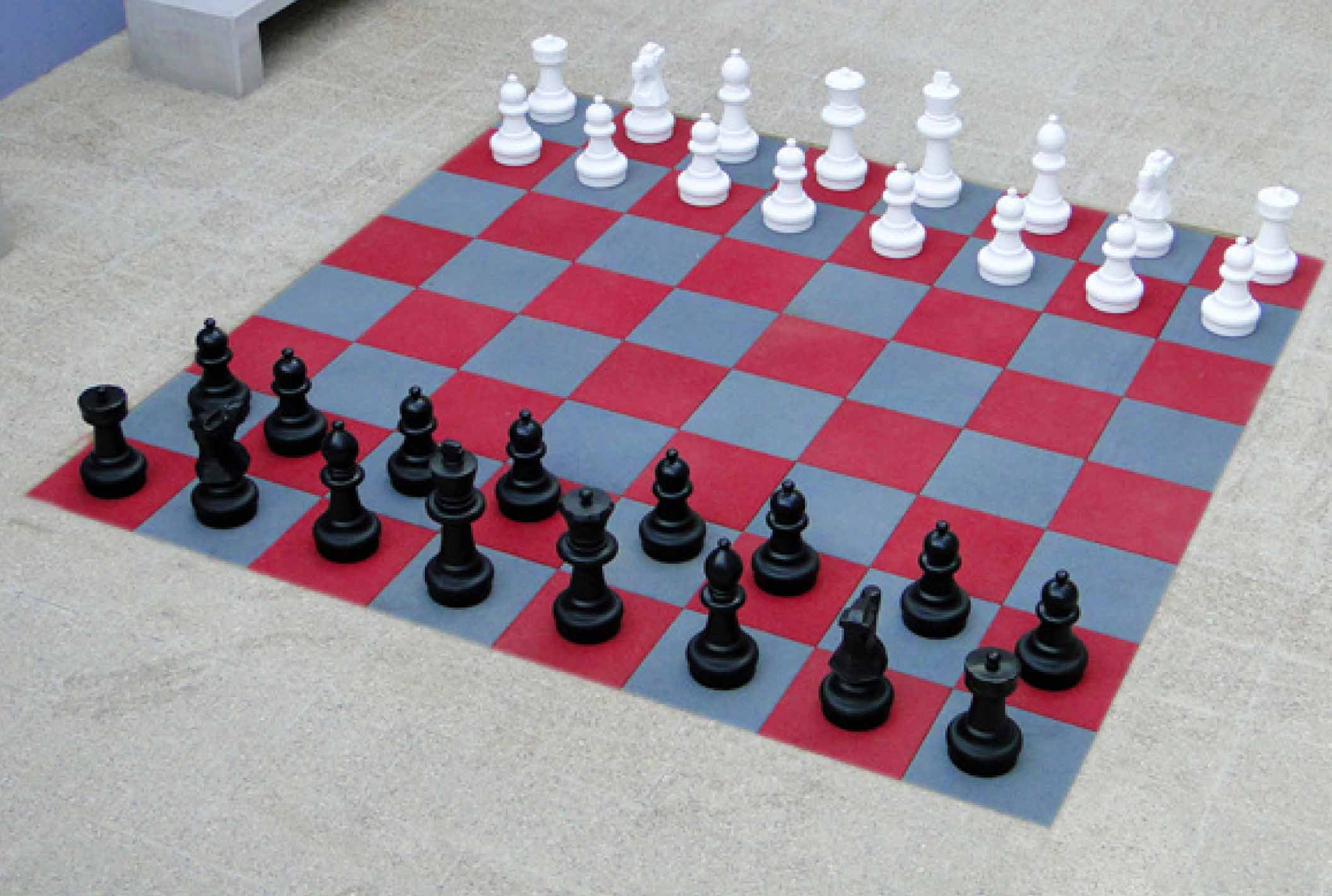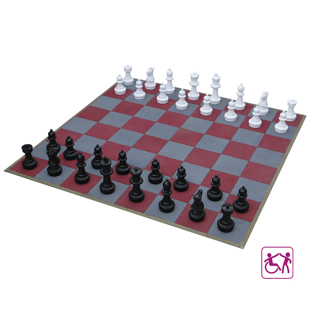 Gigantisk sjakkbrett bestående av 64 kautsjukplater på 500x500x20 mm, i fargene rød og grå.Det inneholder 32 gulvsjakkbrikker laget av sterk plast (16 svarte og 16 hvite), som er uknuselige og værbestandige, ideelle for utendørs bruk. Kongehøyde: 640 mm. Hver figur består av tre seksjoner, basen som er delt i to deler som enkelt kan skrus av og fylles med sand eller lignende for å øke stabiliteten, og til slutt den øvre delen som identifiserer figuren.