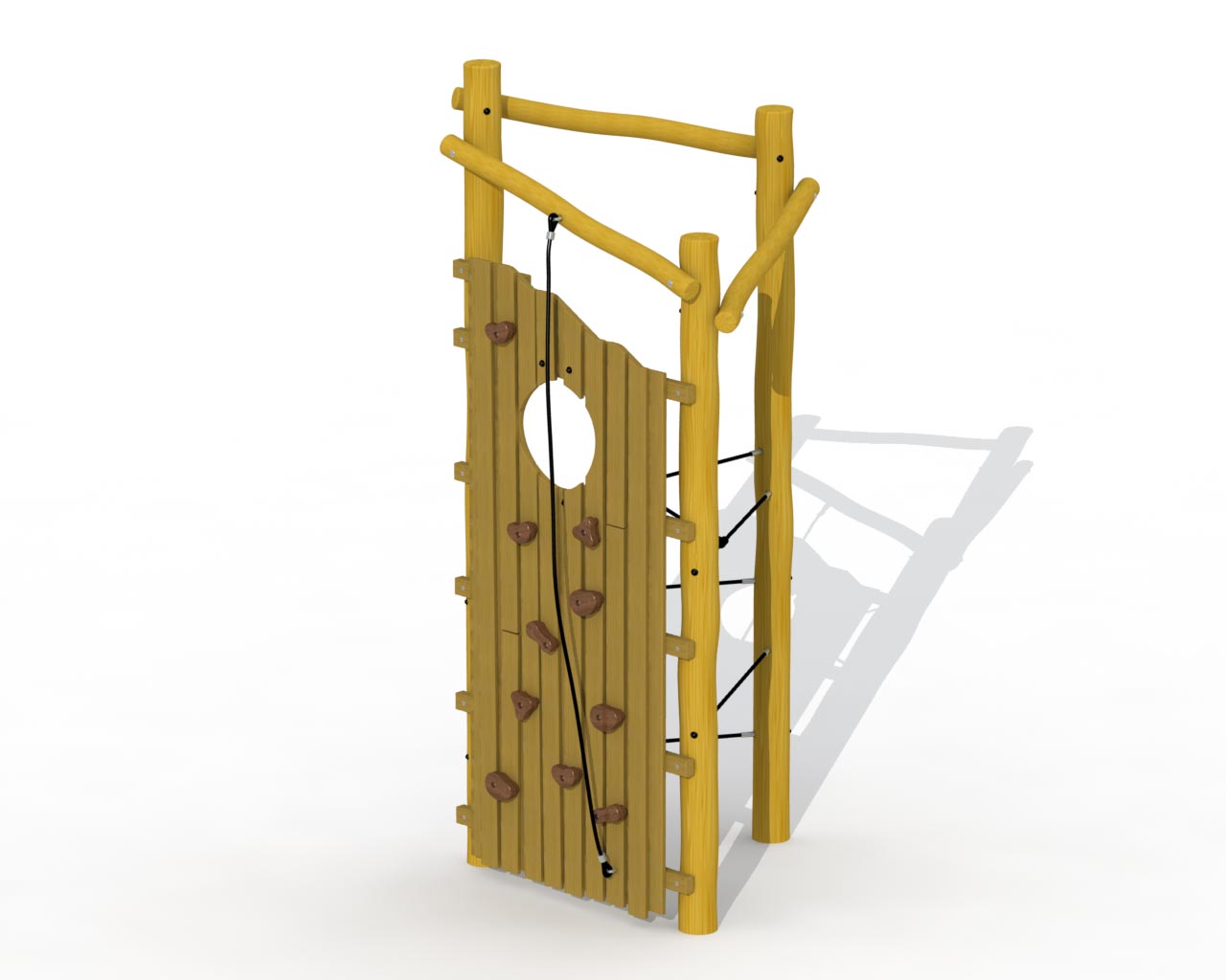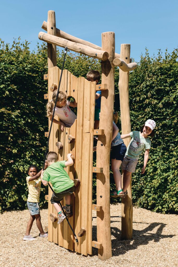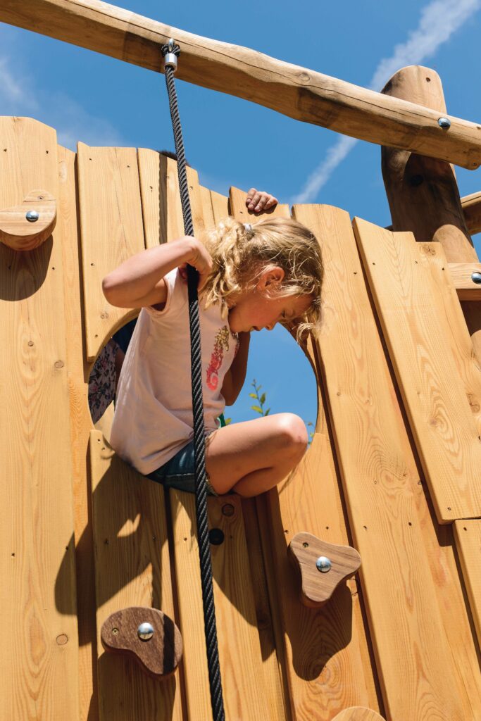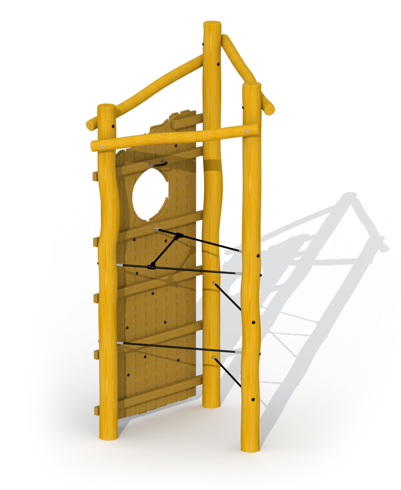 Utfordrende klatretårn for barn i alderen 4 til 16 år. Klatreveggen er laget av lerk, resten av tårnet er laget av Robinia. Klatretårnet kan nås via ulike stier. En klatrevegg med klatregrep laget av padouk eller koaksiale klatretau. Alle muttere og bolter er helt dekket med blomsterformede beskyttelseshetter. Konstruksjonen er festet ned i bakken med betong.