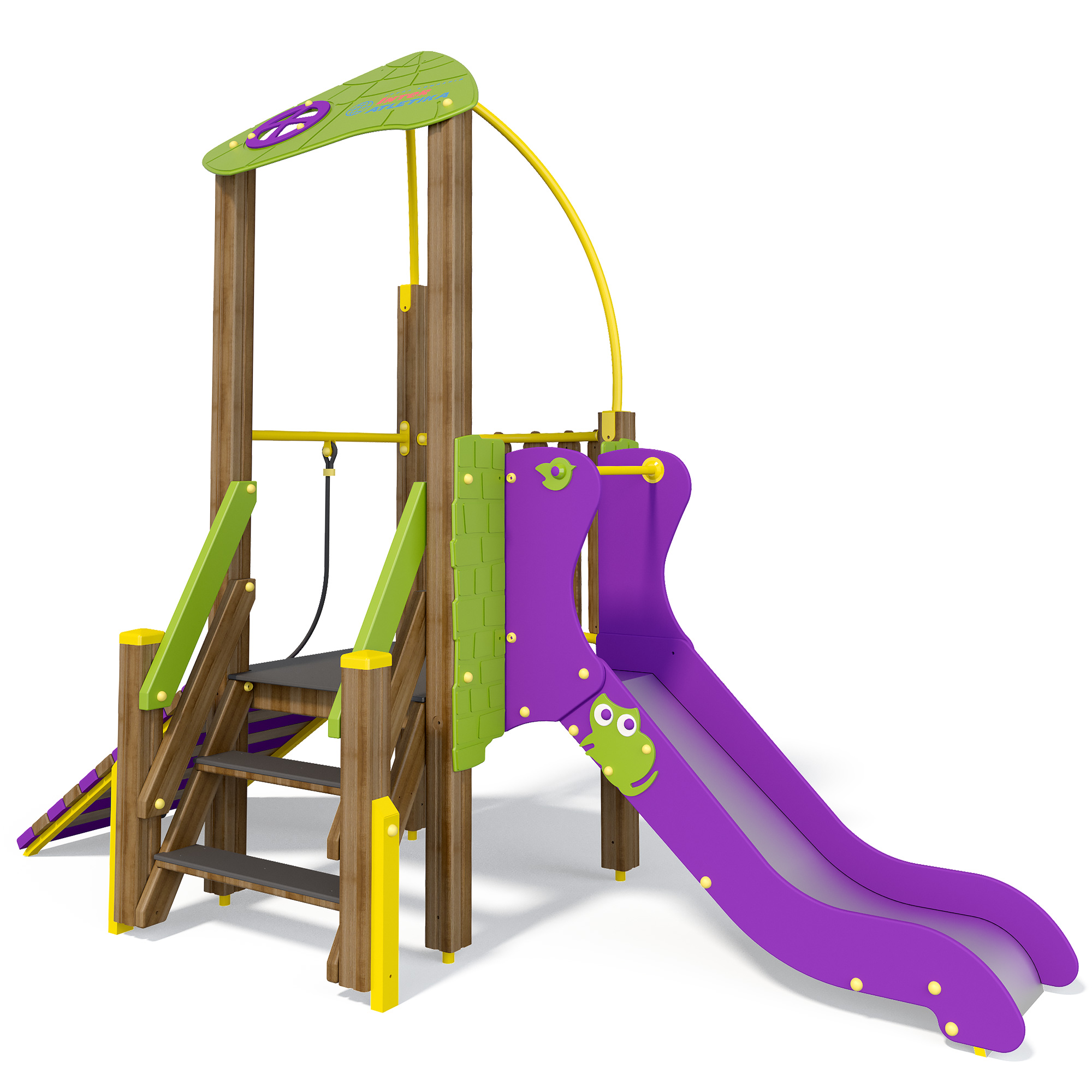 «New» Dette kompakte apparatet er attraktivt og sjarmerende for de minste barna. De liker å leke her, takket være apparatets søte design, lekenhet og holdbarhet. Det er en del av NEW-serien, som motiverer barn til å ikke sitte rolig. En annen fordel de får et bidrag til utviklingen deres. Ineholder sklie, en klatrerampe med tau og tak som skygger for solen.