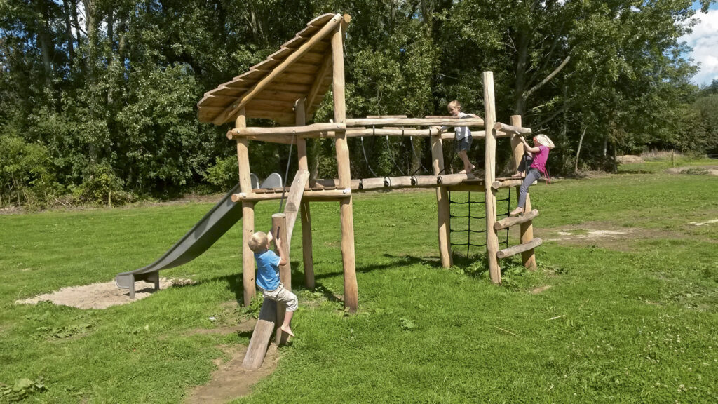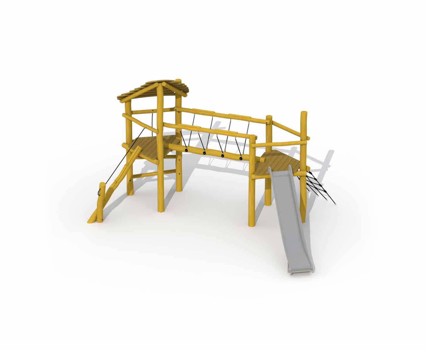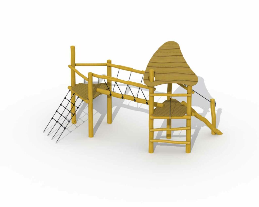 En kombinasjon av to plattformer som er forbundet med en balansebjelke. Plattformene og taket er laget av lerk, resten av lekeutstyret er laget av robini. Den overbygde plattformen kan nås via et klatretau eller en balansebom som går oppover til plattformen. Den åpne plattformen kan nås via et klatrenett, og du kan forlate plattformen med en sklie i rustfritt stål. Alle muttere og bolter er helt dekket med blomsterformede beskyttelseshetter. Denne konstruksjonen festes direkte i bakken ved bruk av betong.