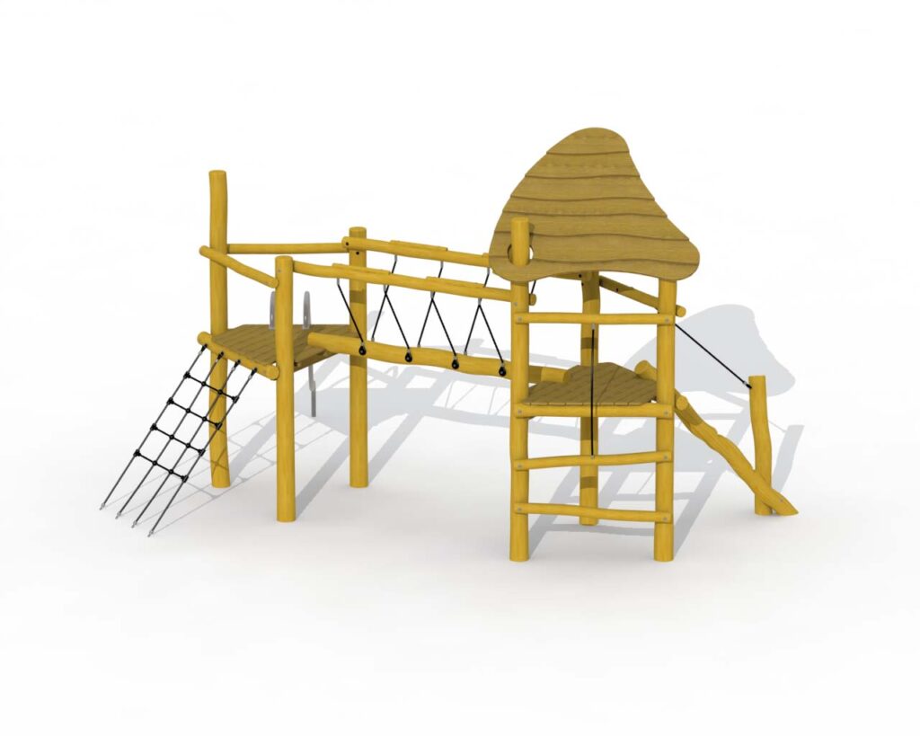 En kombinasjon av to plattformer som er forbundet med en balansebjelke. Plattformene og taket er laget av lerk, resten av lekeutstyret er laget av robini. Den overbygde plattformen kan nås via et klatretau eller en balansebom som går oppover til plattformen. Den åpne plattformen kan nås via et klatrenett, og du kan forlate plattformen med rustfrie stålrør. Alle muttere og bolter er helt dekket med blomsterformede beskyttelseshetter. Denne konstruksjonen festes direkte i bakken ved bruk av betong.