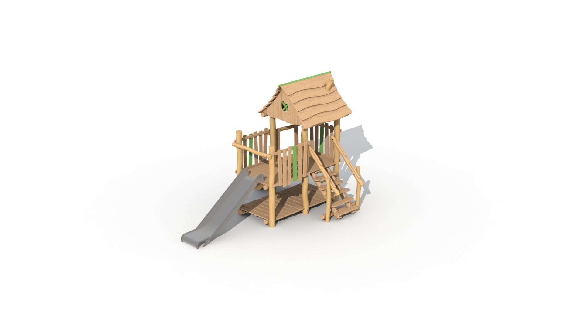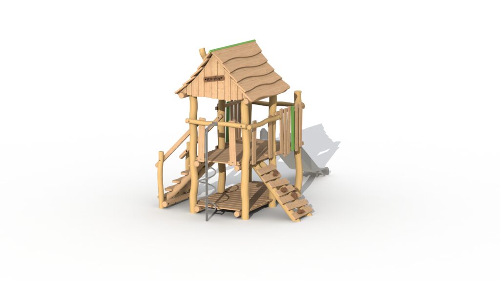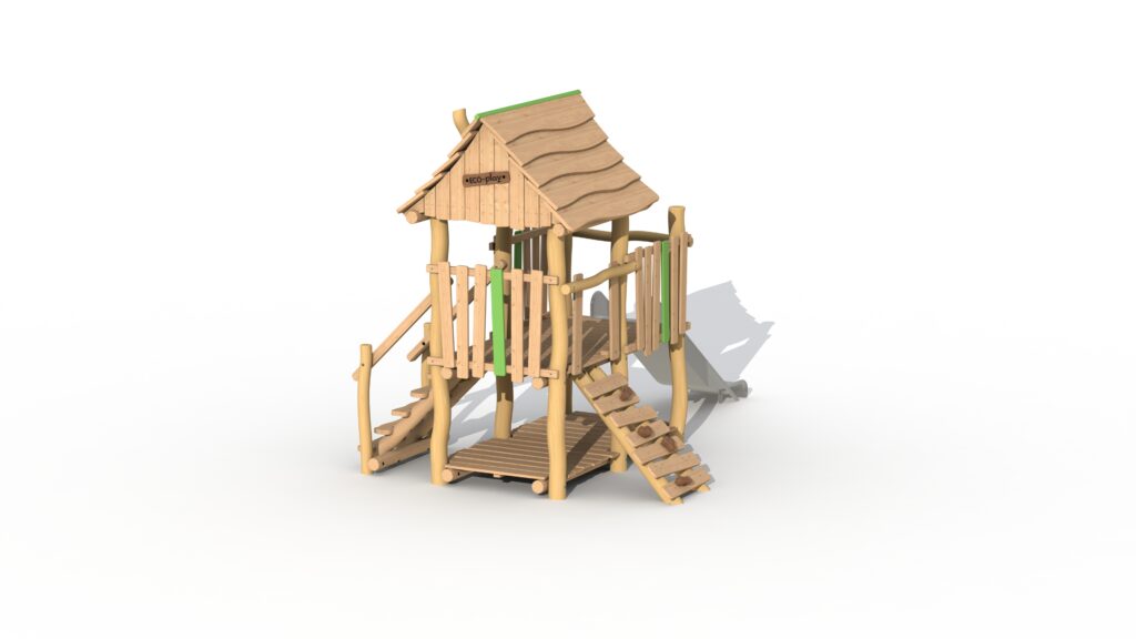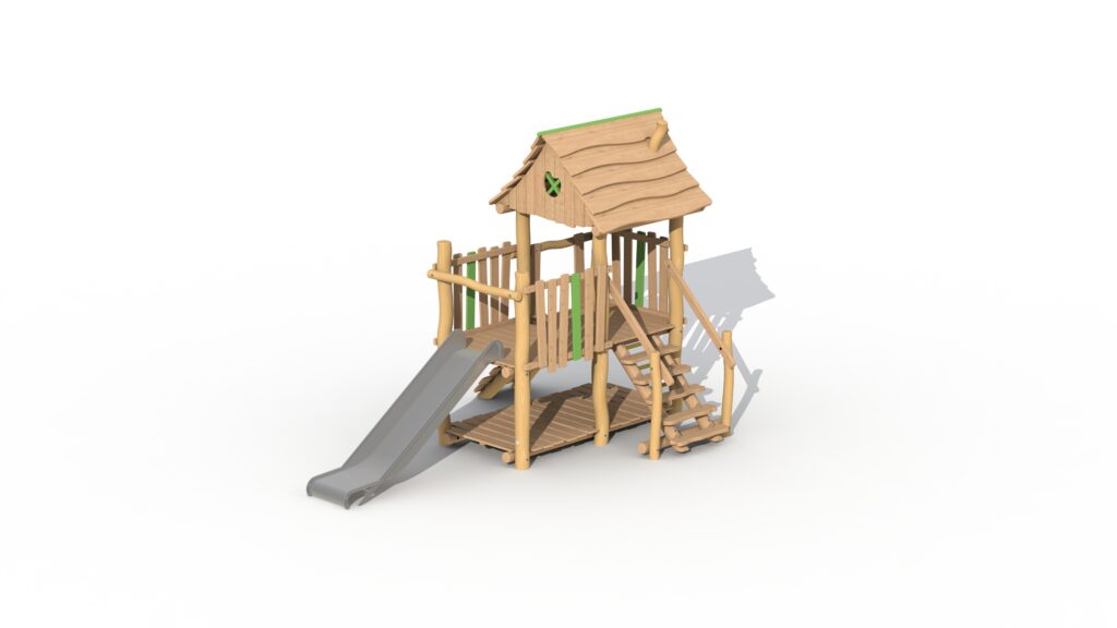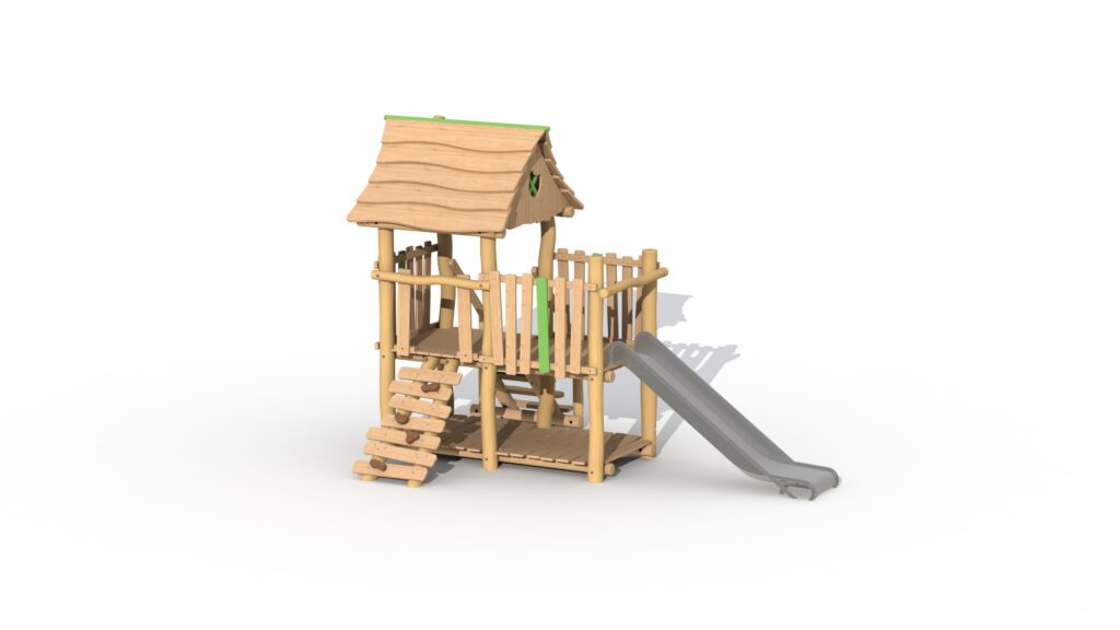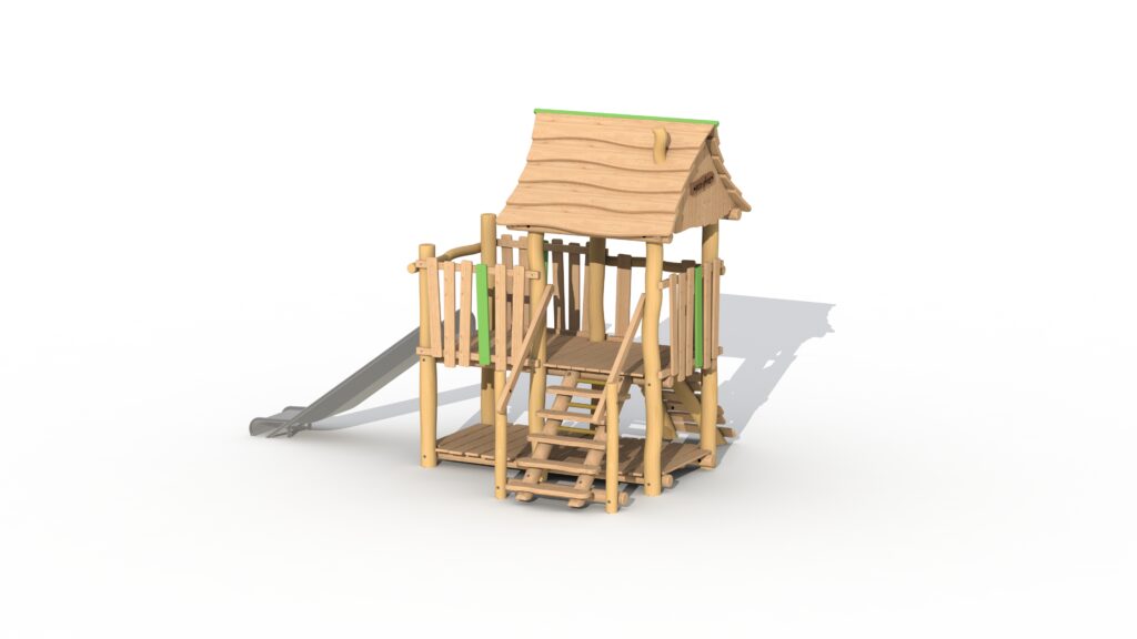 Lekeapparat for de små, fra 2 til 6 år, laget av Robinia og lerketre. Jegertårnet har én stor opphøyd plattform på 95 cm som delvis er dekket av et tak. Plattformen kan nås via en enkel trapp eller klatrevegg med padouk-klatregrep. Barna kan forlate tårnet via sklien i rustfritt stål. Under den forhøyede plattformen er det et lekehus med gulv. En fyrbøterstang (ref. RO008) kan valgfritt legges til jegertårnet. Ved å bruke økologisk maling legges grønne, lekne detaljer til. Lekeutstyret leveres delvis ferdigmontert.
