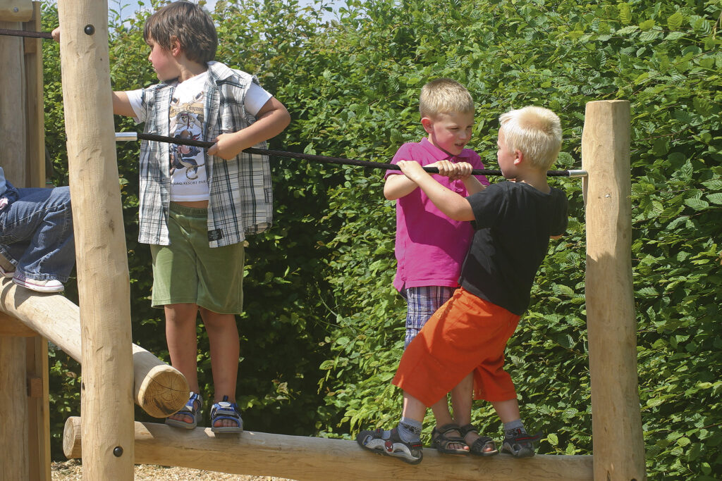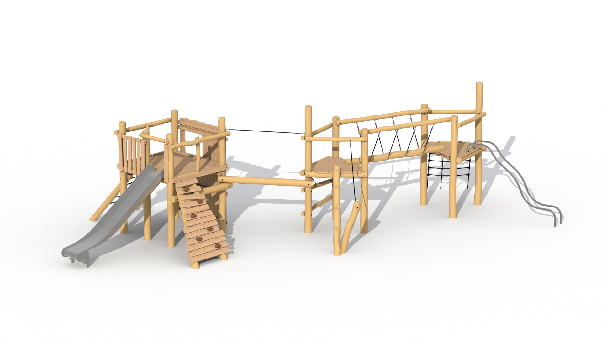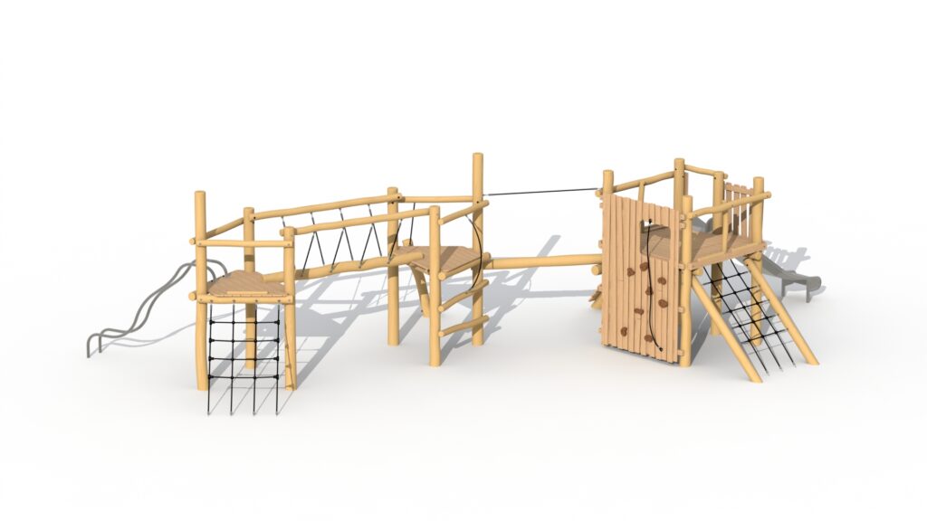 Kombinasjon av vårt magiske tårn, billebro og balansebom. Magitårnet kan nås via forskjellige stier. Du har to vegger med klatregrep laget av padouk. Du har også et klatrenett og en klatrestruktur laget av runde trebjelker og en ståltråd å holde fast i. Du kan forlate Magic Tower gjennom en sklie i rustfritt stål. Leketårnet kan nås via et klatrenett eller et klatretau, og du kan forlate leketårnet gjennom skyverør.