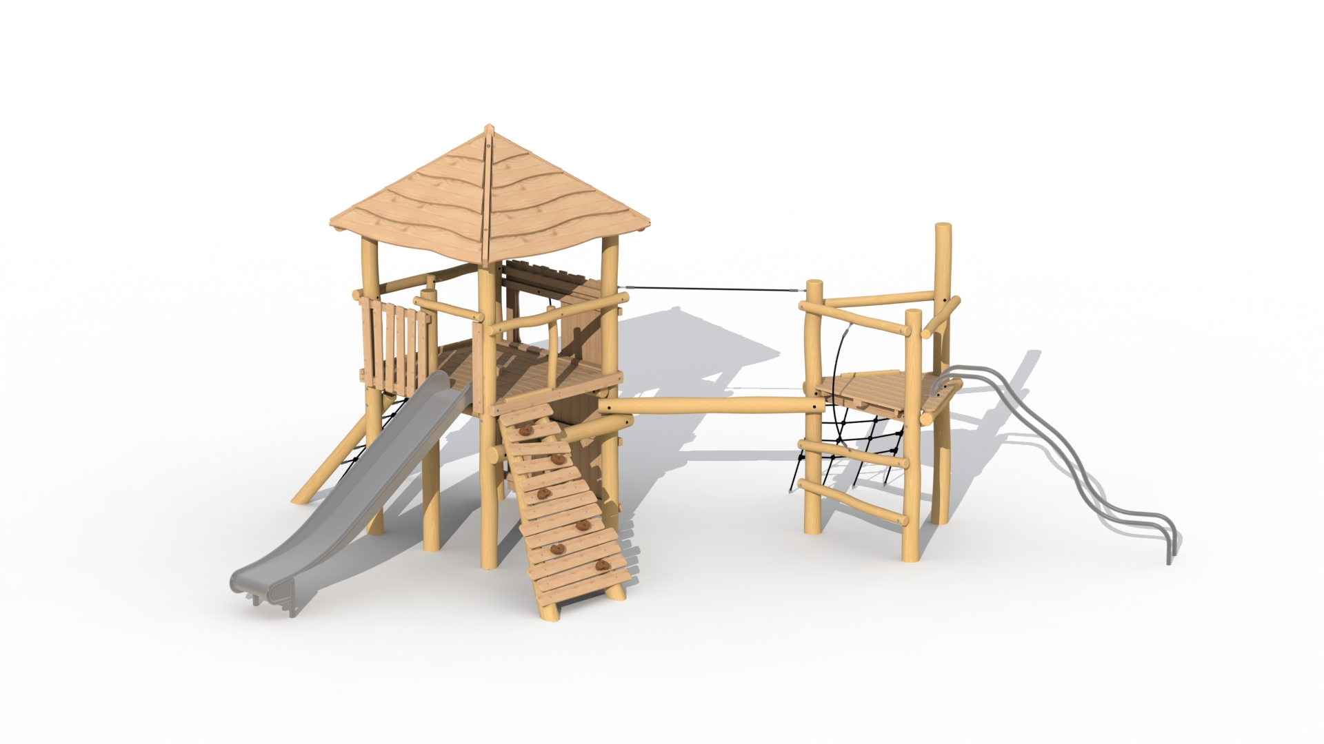 Kombinasjon av vårt magiske tårn med tak, leketårn og balansebom. Magitårnet kan nås via forskjellige stier. Du har to vegger med klatregrep laget av padouk. Du har også et klatrenett og en klatrestruktur laget av runde trebjelker og en ståltråd å holde fast i. Du kan forlate Magic Tower gjennom en sklie i rustfritt stål. Leketårnet kan nås via et klatrenett eller et klatretau, og du kan forlate leketårnet gjennom skyverør.