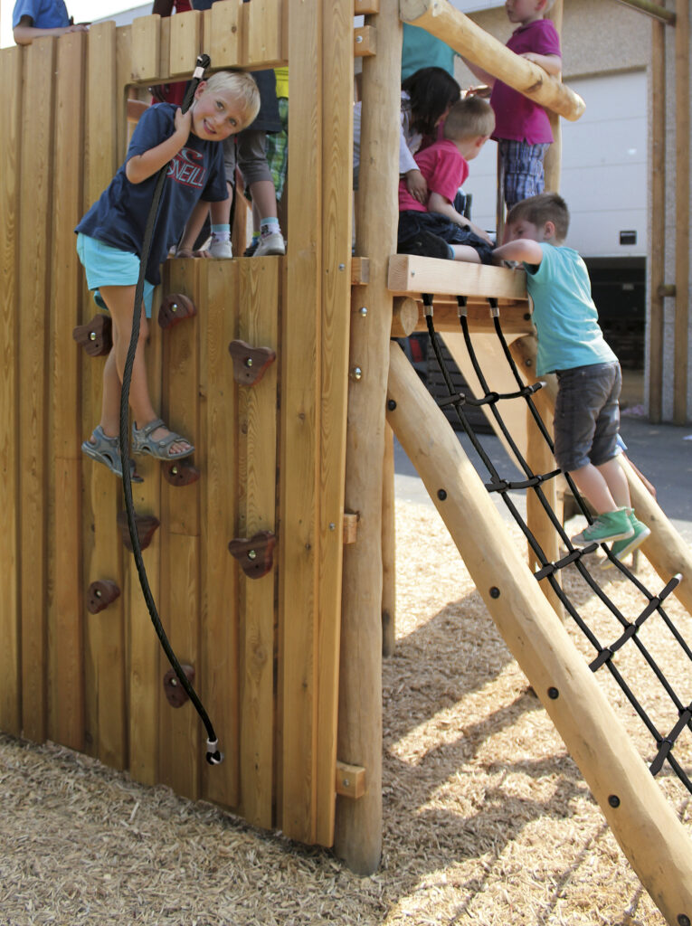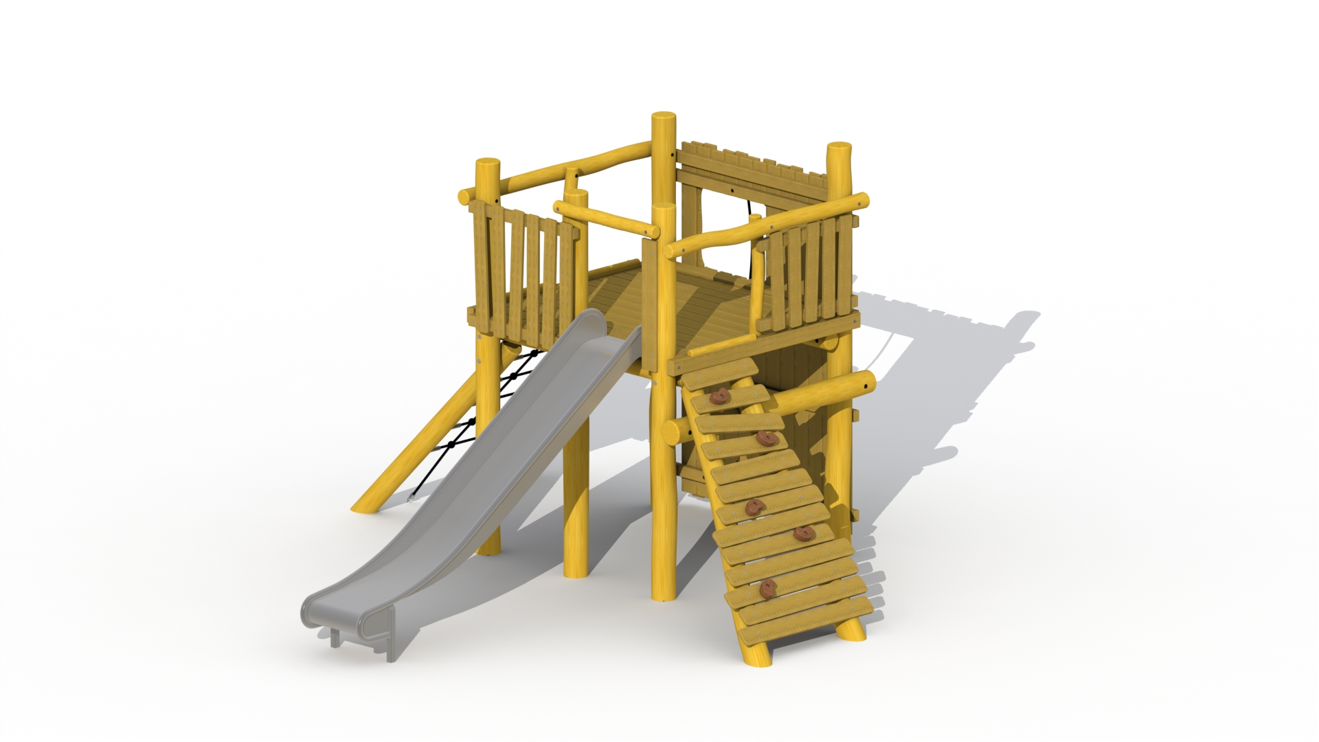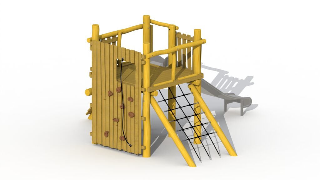 Macic tower med én plattform. Plattformen og sideveggene er laget av lerk, resten av lekeutstyret er laget av Robinia. Leketårnet kan nås via to klatrevegger og et klatrenett. Du kan forlate plattformen ved å bruke en sklie i rustfritt stål. Alle muttere og bolter er helt dekket av blomsterformede beskyttelseshetter. Denne konstruksjonen festes direkte i bakken ved bruk av betong.