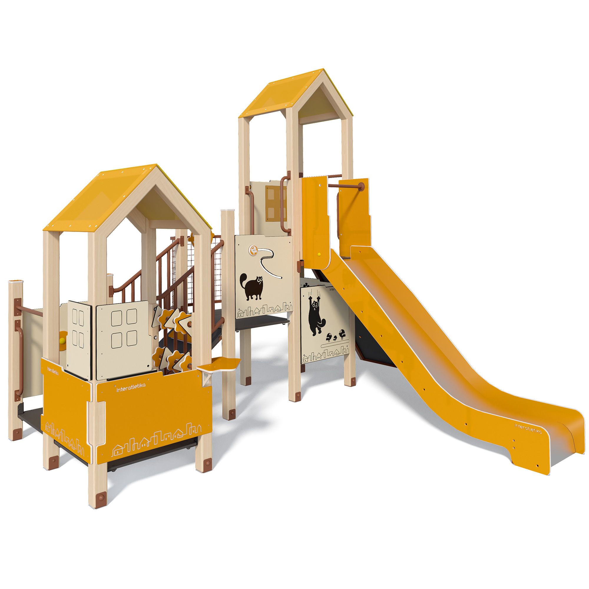«Little Kids» Rainbow inneholder to tårn med mange lekefunksjoner som blant annet en sklie, klatrevegg, kjøkkenkrok, en liten disk, platåer i flere nivåer, veranda med ror, lekepaneler og andre lekeelemneter.