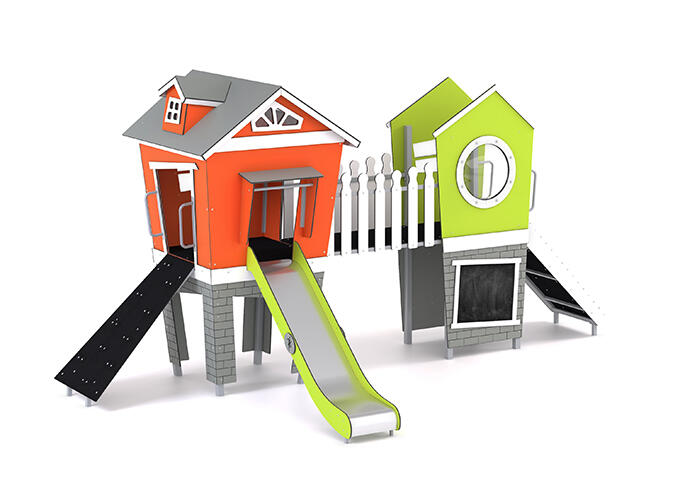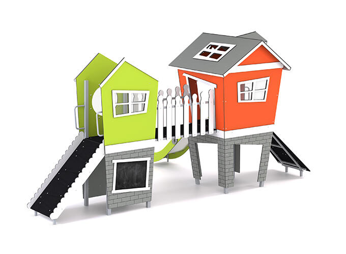Byggingen av husene inkluderer: et tegnebrett med kritt, hvor barn kan vise frem tegneferdighetene sine; et speil laget av polert rustfritt stål hvor barn kan leke med speilbildet av seg selv og venner; en sklie i rustfritt stål på 1200 mm med HDPE-sidepaneler; et koøye på 500 mm. Velg mellom 12 standard farger på stål og 8 standard farger på HDPE. Andre farger på forespørsel.