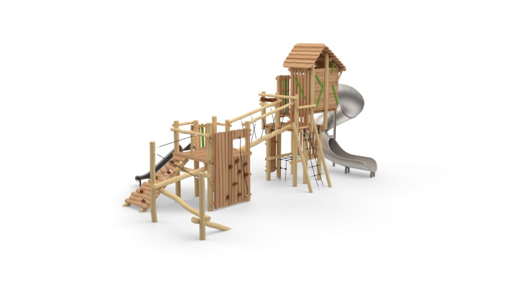 Lekeapparater produsert i Robinia kombinerer naturlig estetikk med høy funksjonalitet og slitestyrke. Robinia er et svært hardt og holdbart treslag som egner seg spesielt godt til utendørs lekeplasser, da det tåler vær, fukt og intensiv bruk over lang tid uten behov for kjemisk impregnering. Robinia har et organisk og naturpreget utseende som gjør at lekeapparatene passer godt inn i parker, skolegårder, barnehager og naturlekeplasser. Hver stolpe har sin egen form og struktur, noe som gir hvert apparat et unikt uttrykk. Robinia-konstruksjoner kan integrere ulike elementer som klatretau, nett, balansestokker, plattformer og rutsjebaner. Dette gir mange ulike lekemuligheter i ett og samme apparat og gjør lekeplassen mer variert og utfordrende.