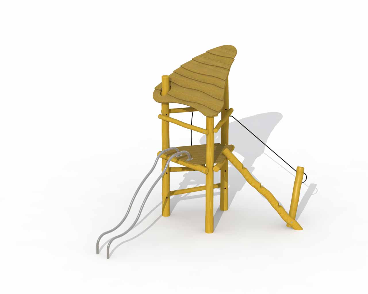 Leketårn med tak og rustfrie stålrør. Plattformene og taket er laget av lerk, resten av lekeutstyret er laget av Robinia. Leketårnet kan nås via et klatretau eller en balansebom som går opp til den dekkede plattformen. Du kan forlate leketårnet ved å bruke rustfrie stålrør. Denne konstruksjonen festes direkte i bakken ved bruk av betong.