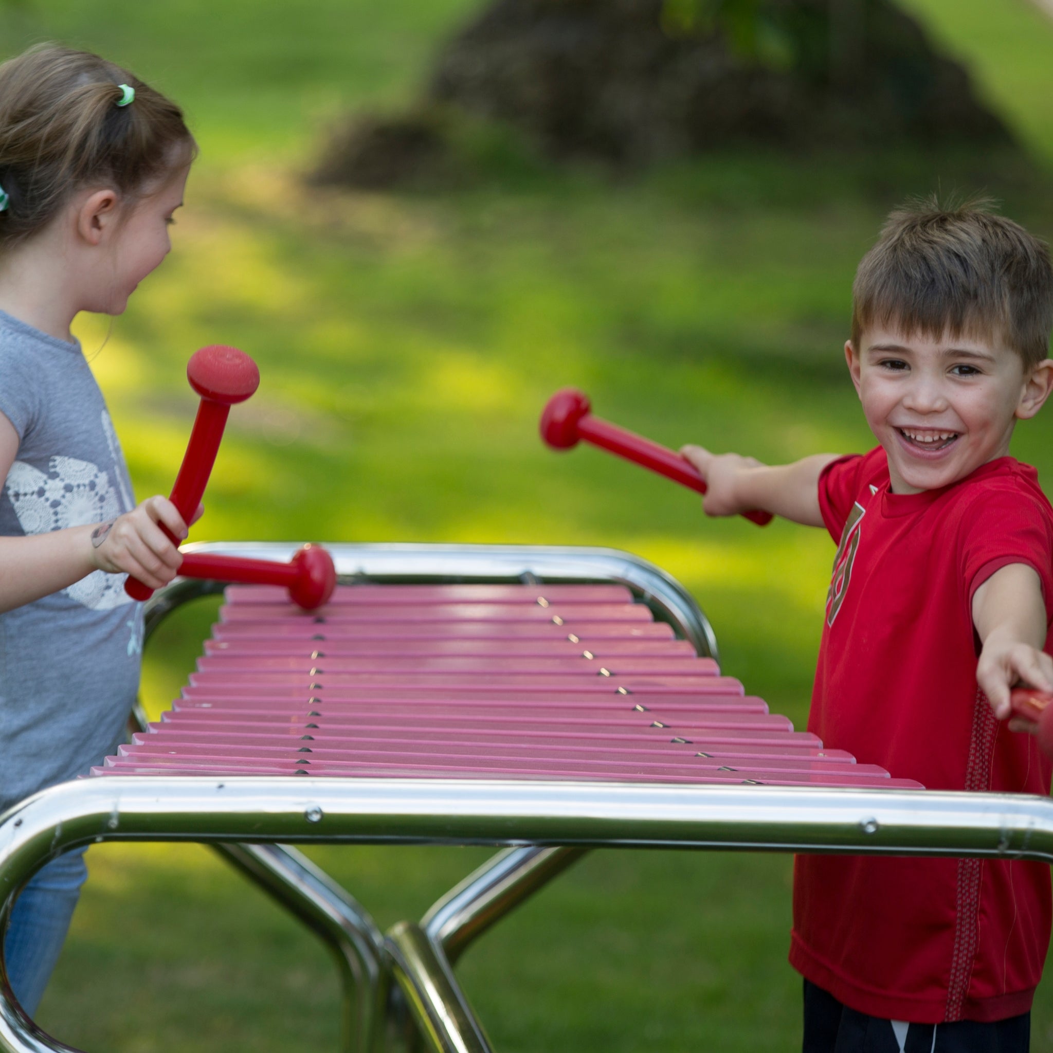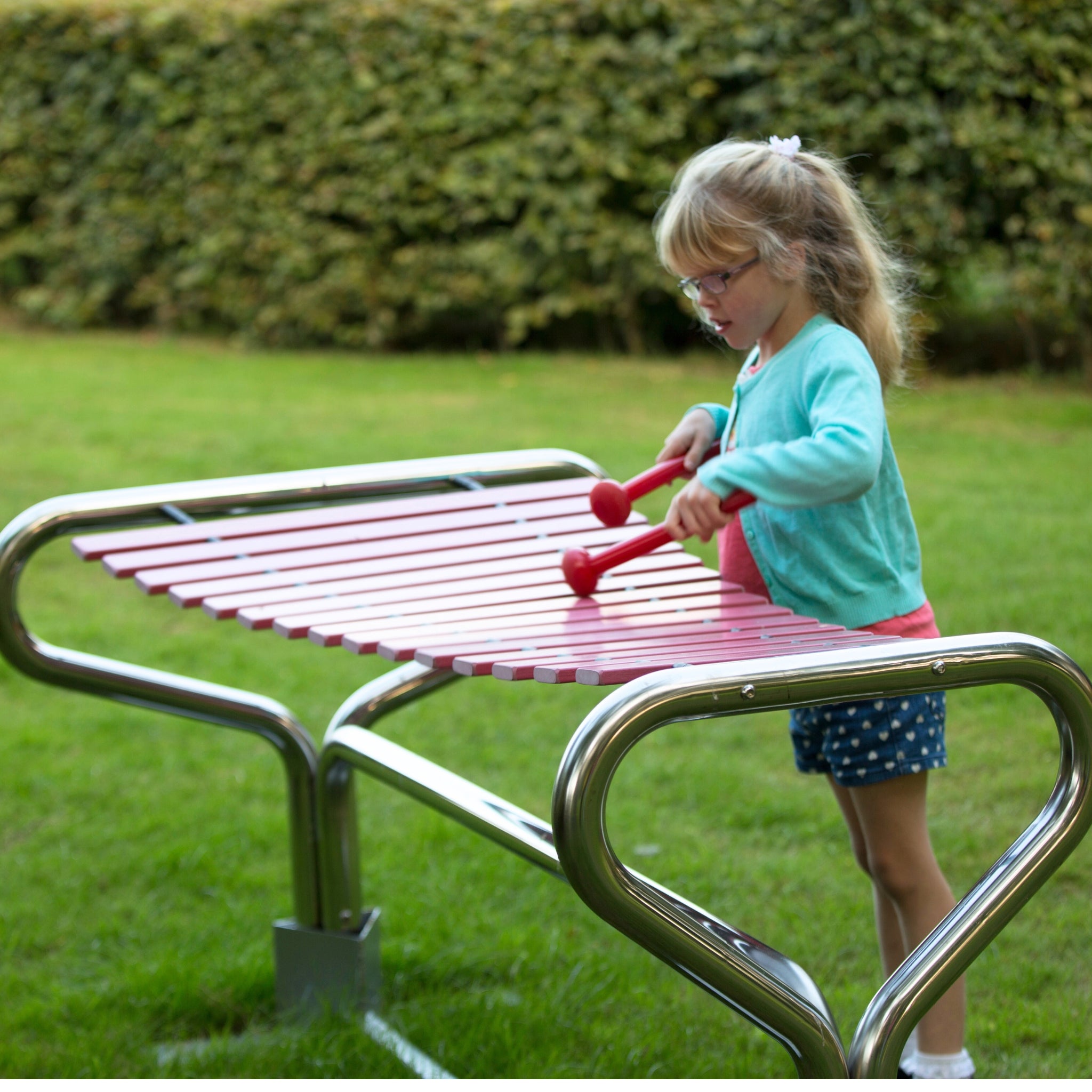 Marimba er en utendørsmarimba med brede treklaffer og en varm, resonant lyd. Spilt med køller belønner det både rolige mønstre og mer energisk lek med tydelig respons, slik at barn og voksne raskt kan skape puls, basslinjer og enkle melodier. Formatet egner seg for skolegårder, parker og sansehager, hvor instrumentet fungerer som et synlig lydpunkt uten å ta opp plass slik de største modellene gjør. Konstruksjonen er designet for utendørs bruk året rundt med lite vedlikehold. Velg bakkemontering for myk grunn eller overflatemontering for asfalt og betong, og kombiner med klokkespill eller xylofon for en balansert musikksone. Marimbaen støtter fordelingen av roller i små grupper: én legger til bass/grunnleggende puls, en annen fyller ut med mønstre eller melodiske figurer. Den klare klangen hjelper brukerne å høre tempo, dynamikk og timing, noe som gjør korte utbrudd av ekko, turtaking og «følg lederen» effektivt. Materialer og overflater er valgt for utendørs bruk året rundt, så drift og rengjøring forblir enkel.