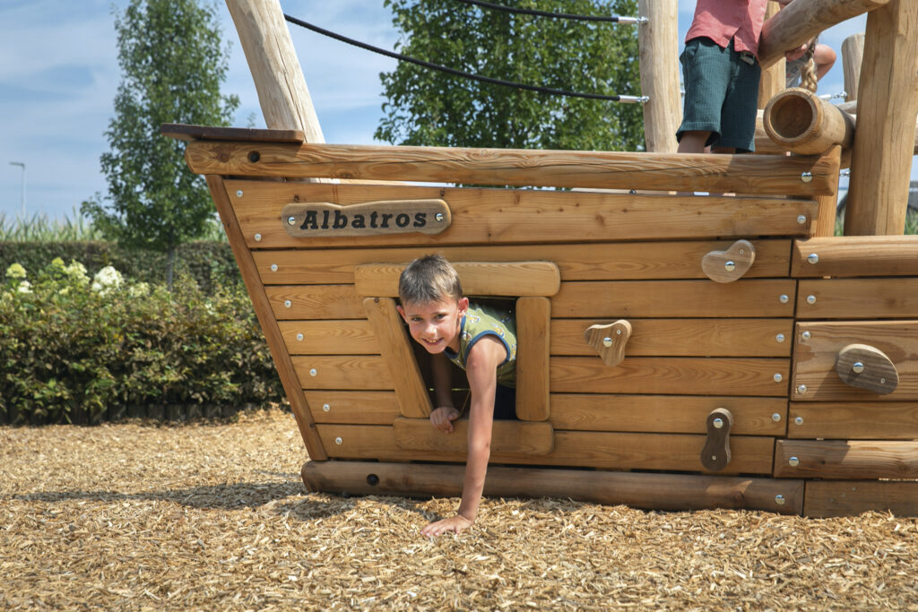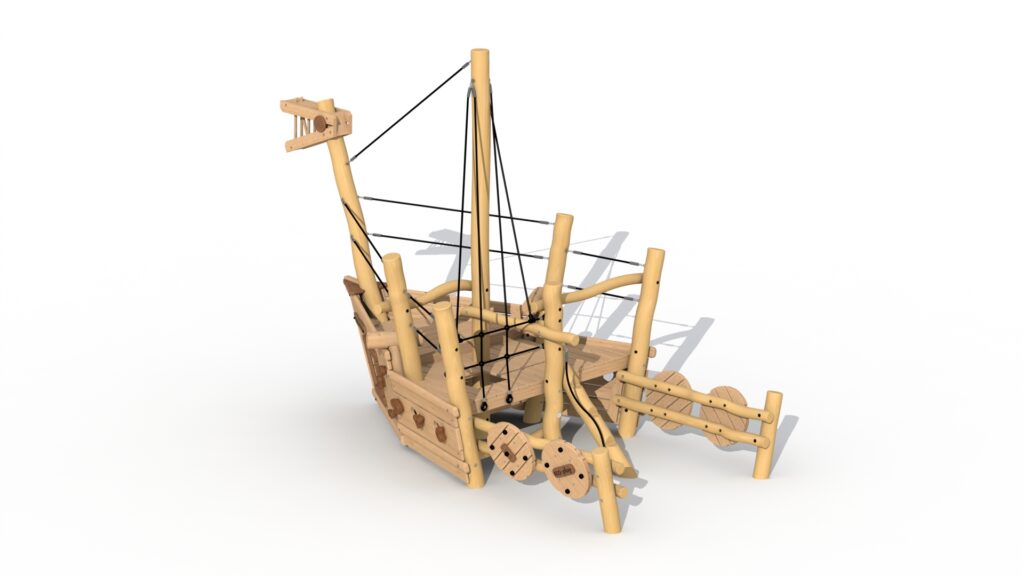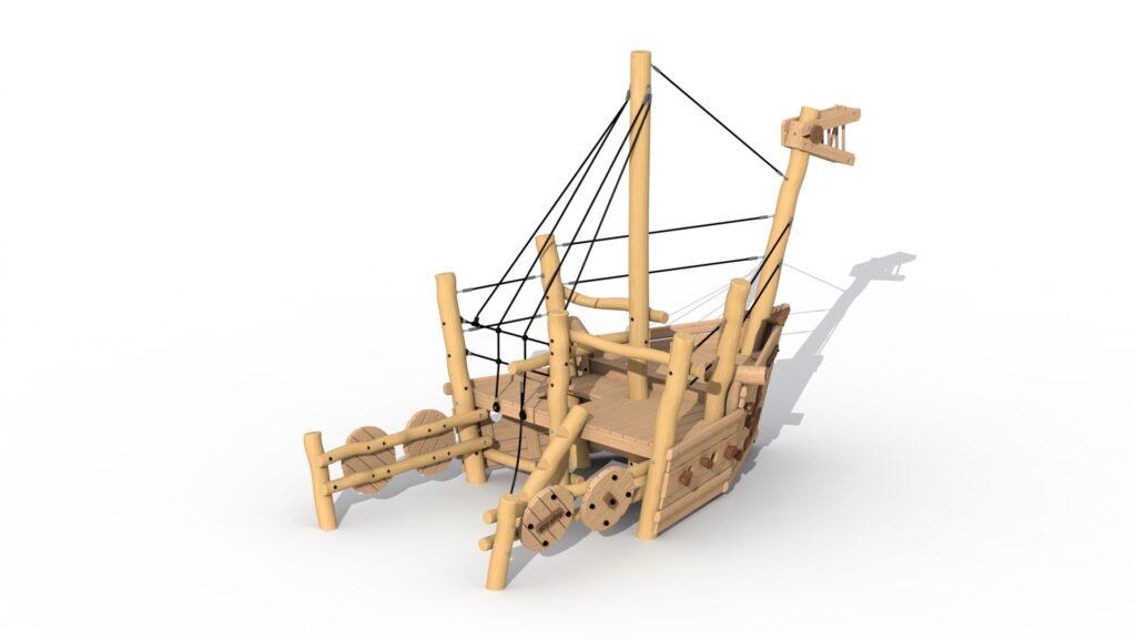 Lekeutstyr i Robinia-treet som vikingbåt. Stammen (ref. RO720) har et dragehode, et nett, treskjold og flere kryphull. Nettet og tauene er laget av polypropylentau med ståltrådsforsterkning, klatregrepene er laget av Robinia. De runde trestolpene er festet ned i bakken. Alle metalldeler er behandlet mot rust, og alle muttere og bolter er helt dekket med beskyttelseshetter.