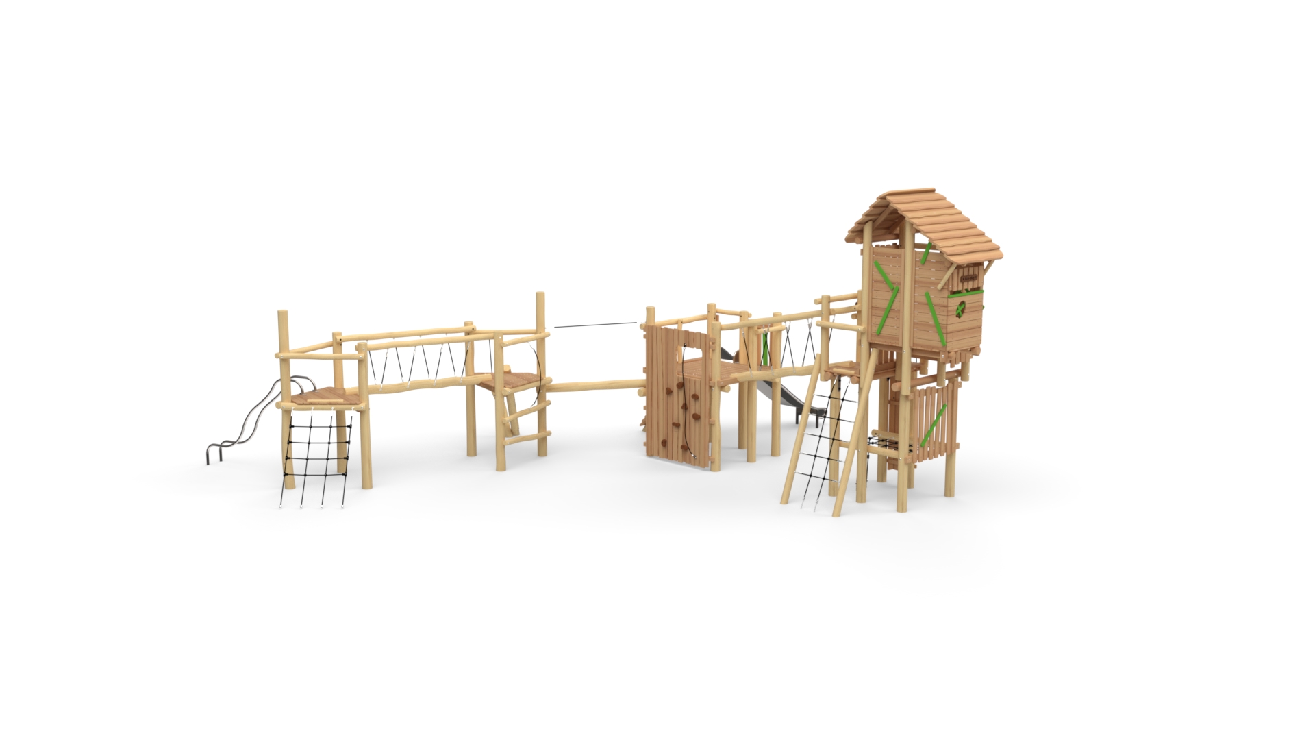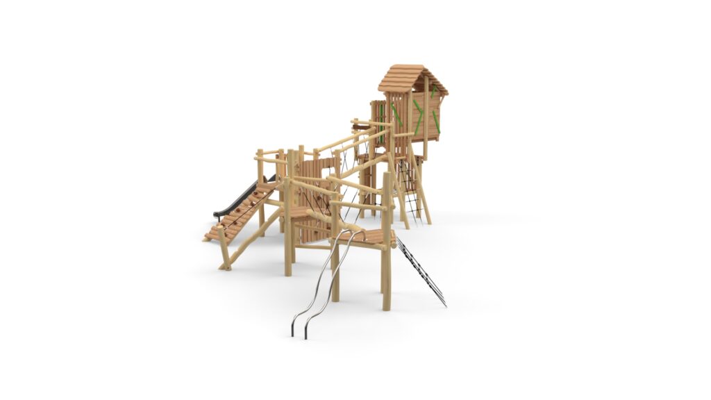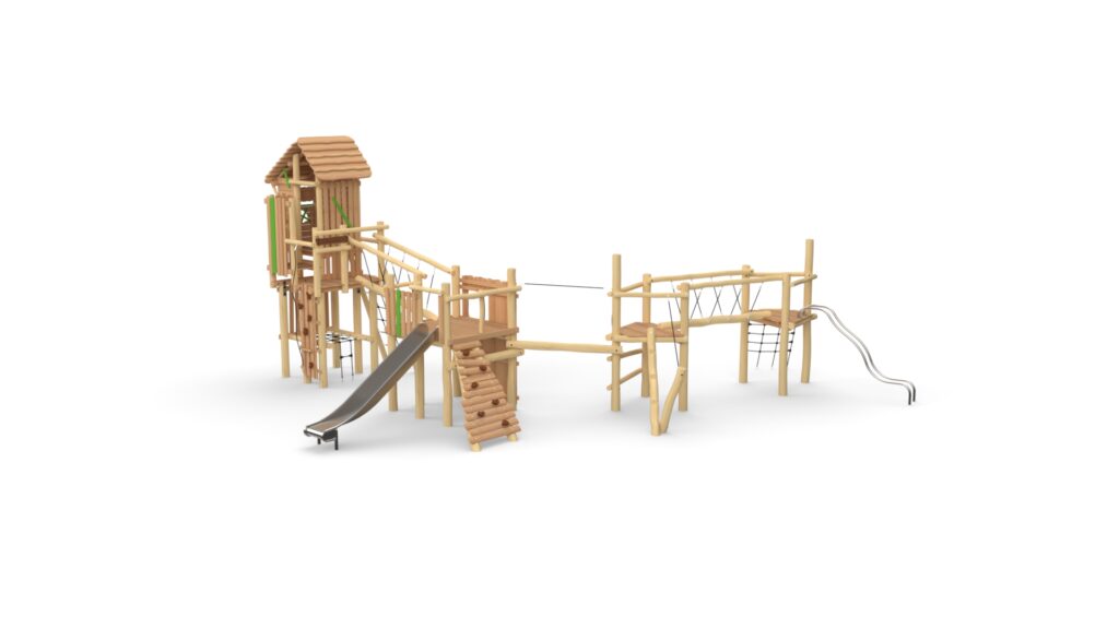 Lekeapparater produsert i Robinia kombinerer naturlig estetikk med høy funksjonalitet og slitestyrke. Robinia er et svært hardt og holdbart treslag som egner seg spesielt godt til utendørs lekeplasser, da det tåler vær, fukt og intensiv bruk over lang tid uten behov for kjemisk impregnering. Robinia har et organisk og naturpreget utseende som gjør at lekeapparatene passer godt inn i parker, skolegårder, barnehager og naturlekeplasser. Hver stolpe har sin egen form og struktur, noe som gir hvert apparat et unikt uttrykk. Robinia-konstruksjoner kan integrere ulike elementer som klatretau, nett, balansestokker, plattformer og rutsjebaner. Dette gir mange ulike lekemuligheter i ett og samme apparat og gjør lekeplassen mer variert og utfordrende.